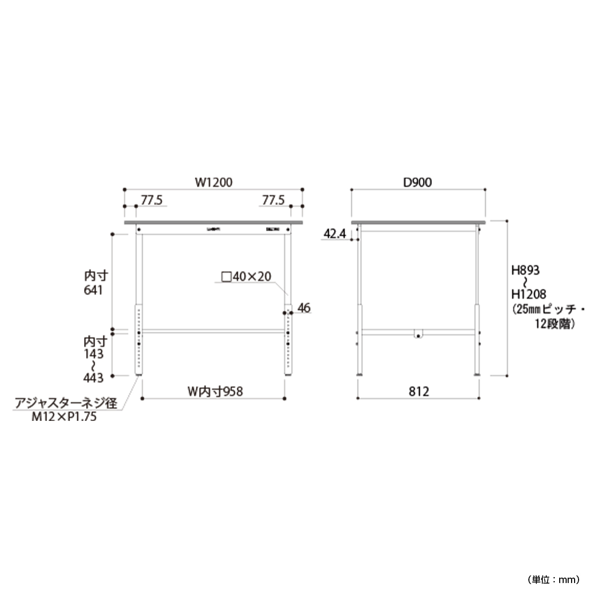 高さを900~1200mmの間で25mmピッチで調整し、身長や作業内容に合わせて、使いやすい位置にセットしてお使いいただけます。