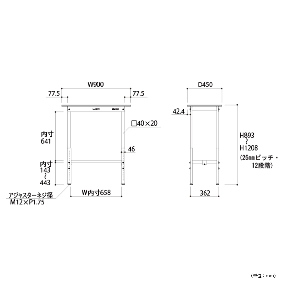高さを900~1200mmの間で25mmピッチで調整し、身長や作業内容に合わせて、使いやすい位置にセットしてお使いいただけます。