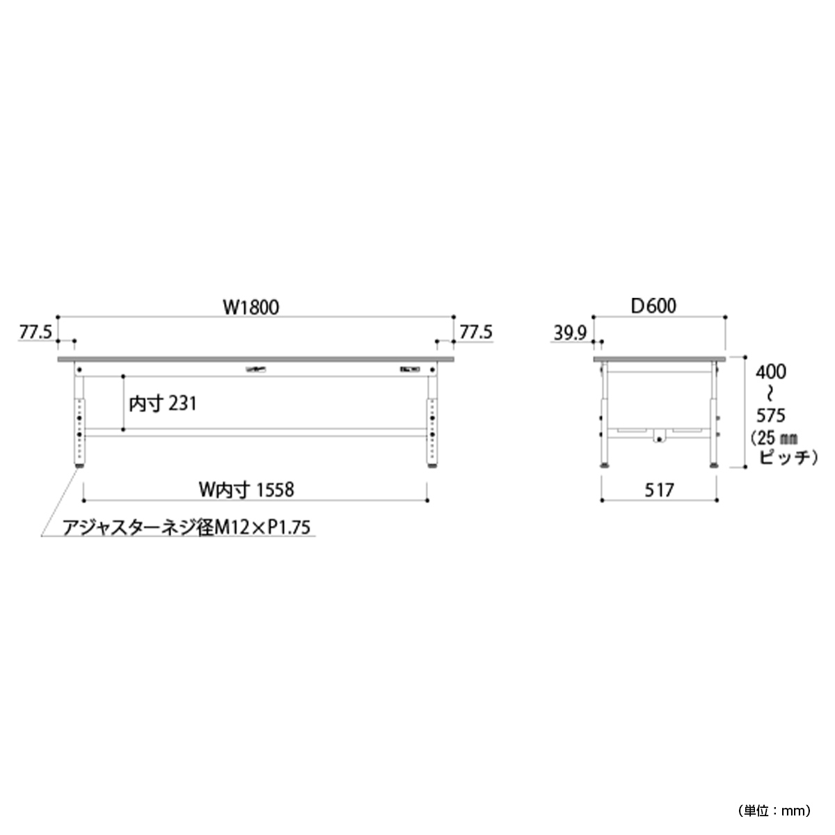 耐荷重150kgで軽作業に最適化された、幅1800mm×奥行600mmの高さ調整式ワークテーブルのロータイプです。