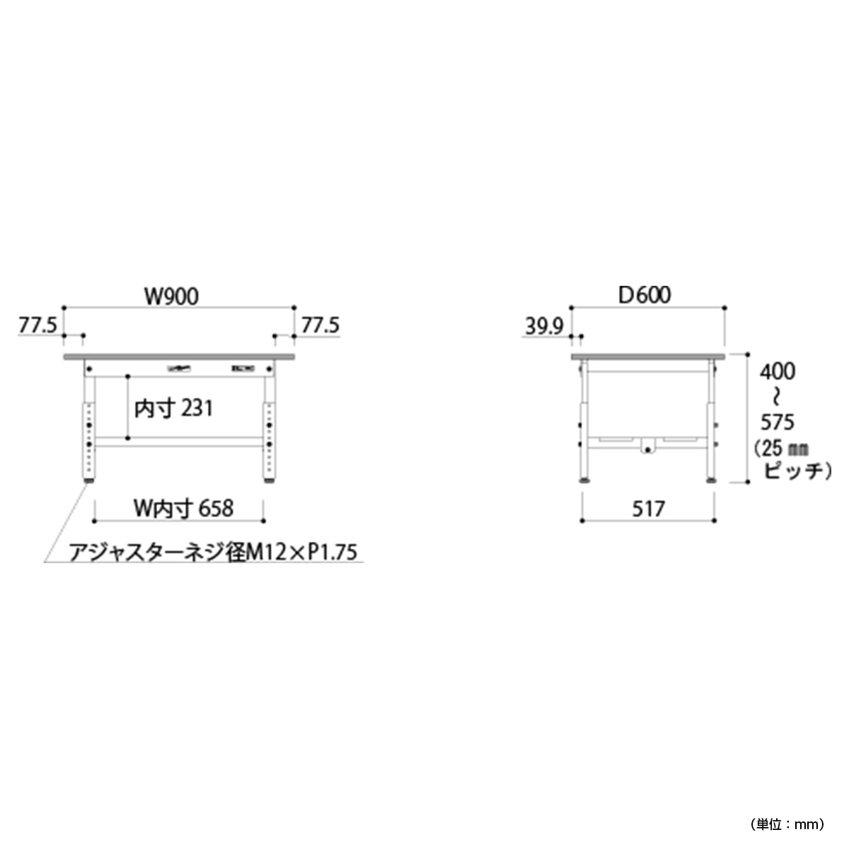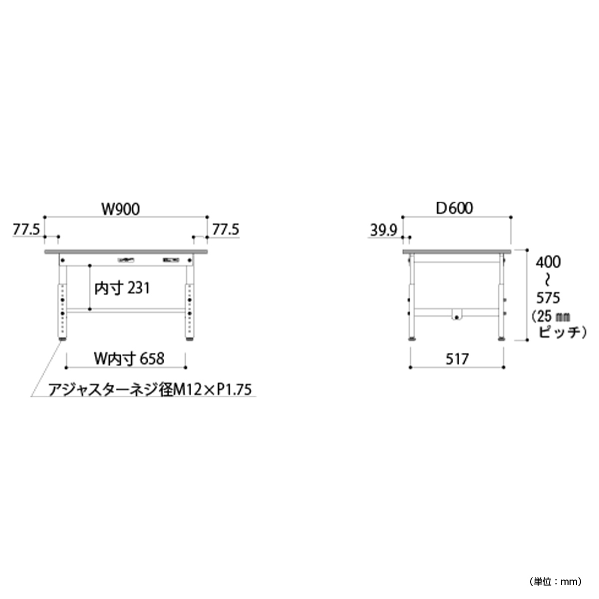高さを400~575mmの間で25mmピッチで調整し、身長や作業内容に合わせて、使いやすい位置にセットしてお使いいただけます。