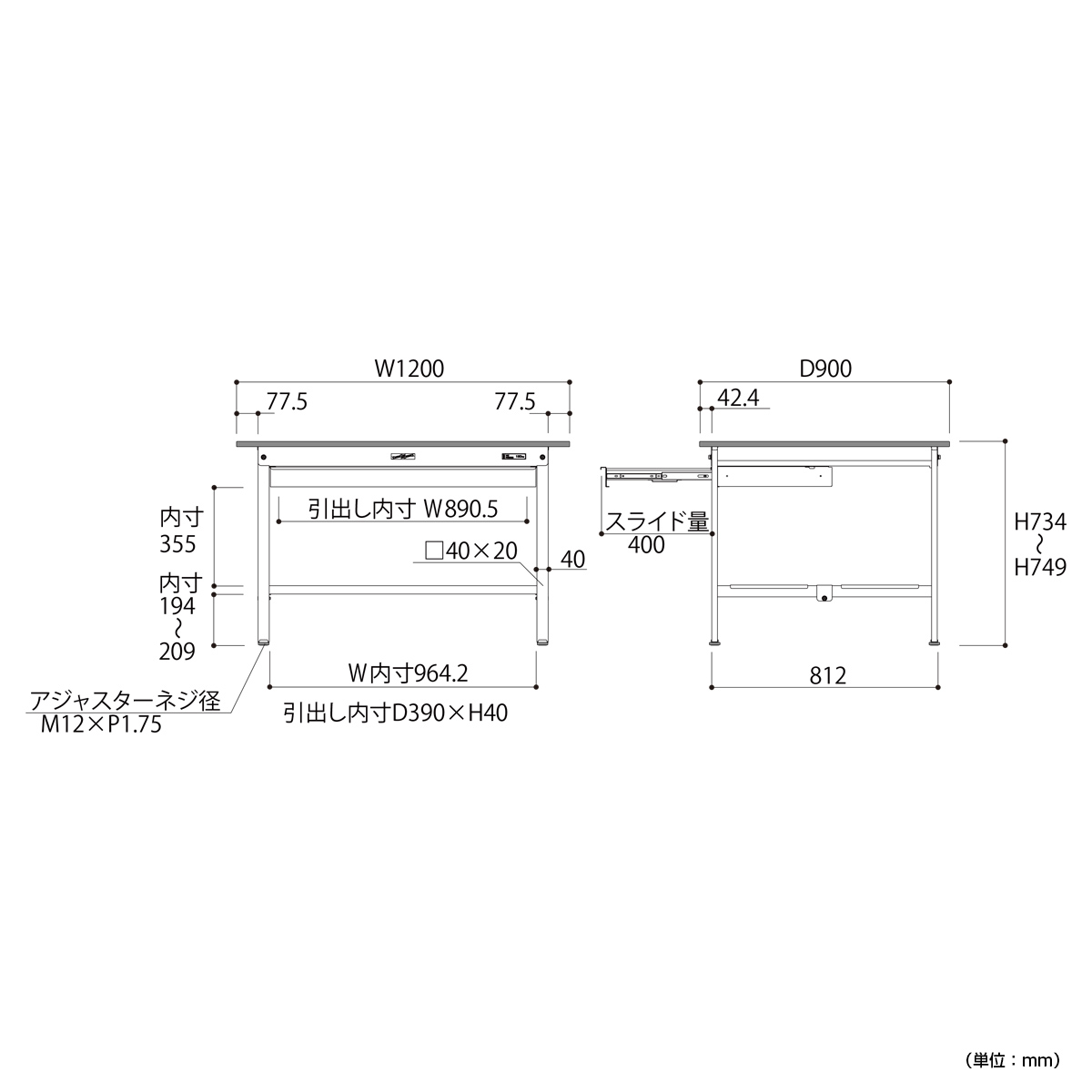 ワイド引出し付き固定式ワークテーブル(W1200×D900×H740)