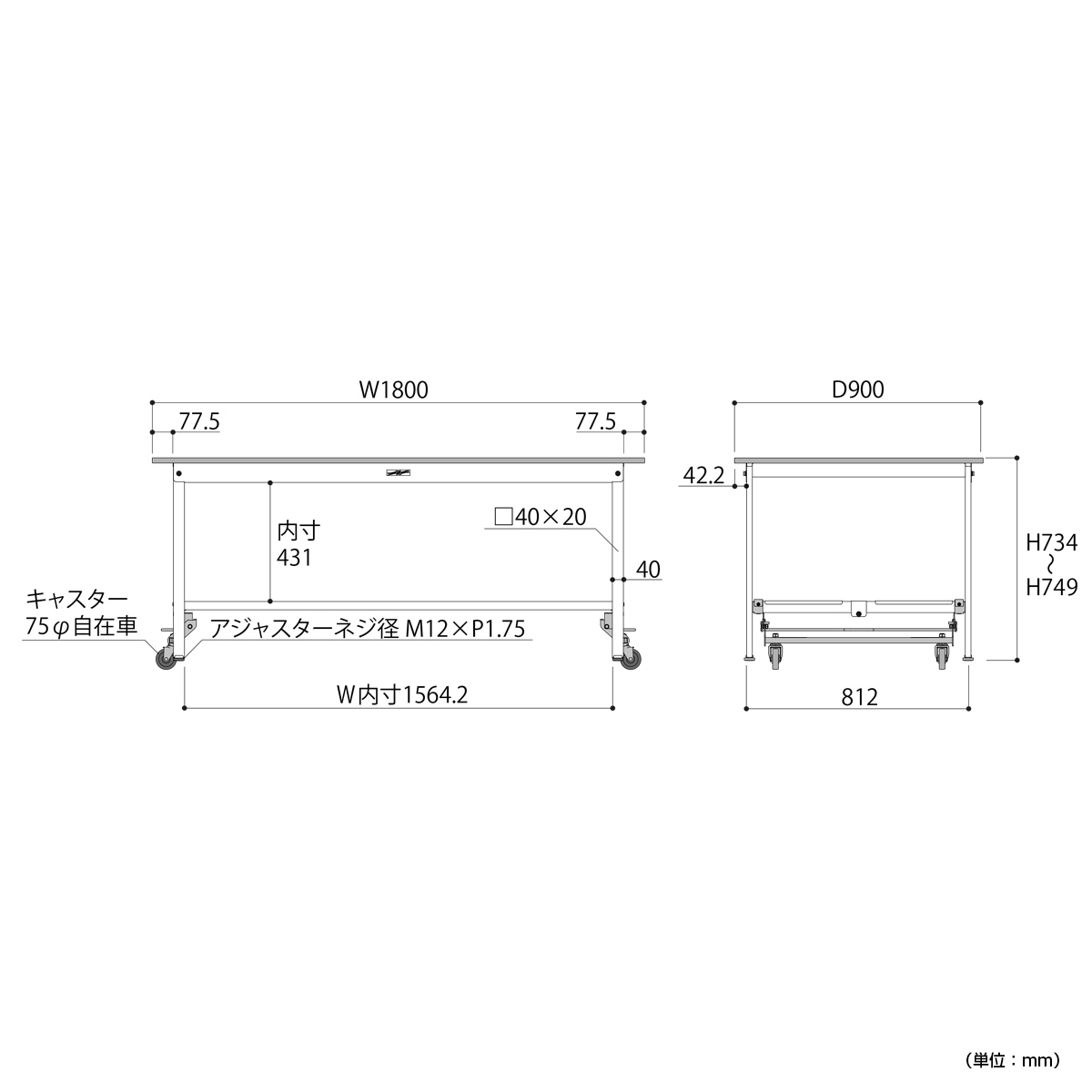 | 材質 | 天板:低圧メラミン(19mm厚) 棚板・脚部:スチール(粉体塗装) キャスター:75Φ自在ゴムキャスター |