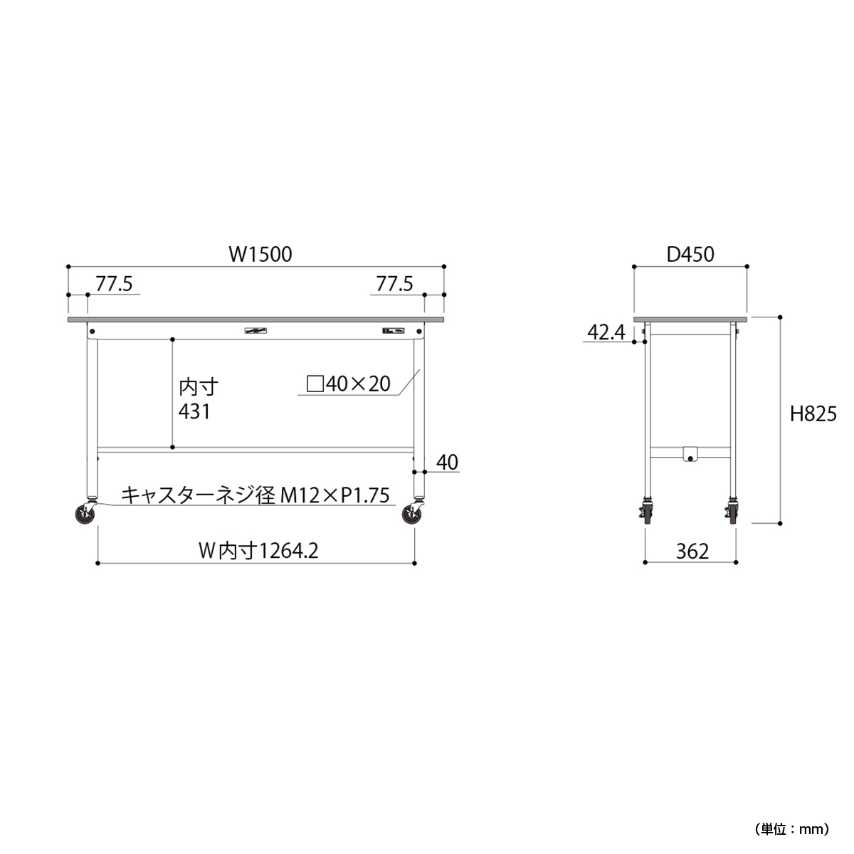 | 材質 | 天板:低圧メラミン(19mm厚) 脚部:スチール(粉体塗装) キャスター:75Φゴムキャスター(自在ストッパー付4個) |