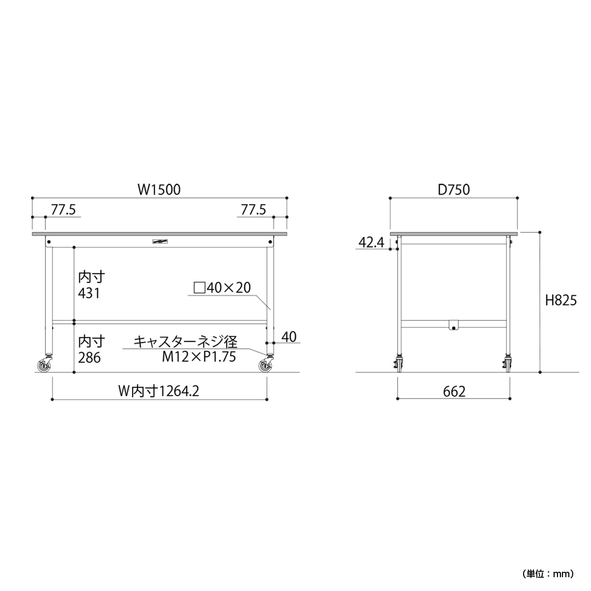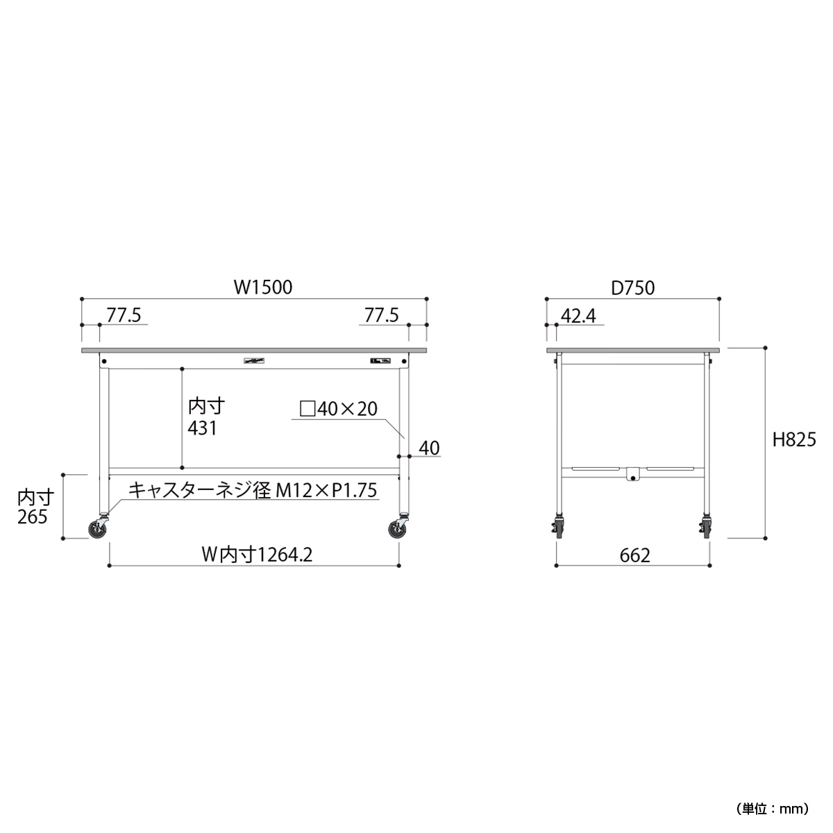 | 材質 | 天板:低圧メラミン(19mm厚) 脚部・棚板:スチール(粉体塗装) キャスター:75Φゴムキャスター(自在ストッパー付4個) |