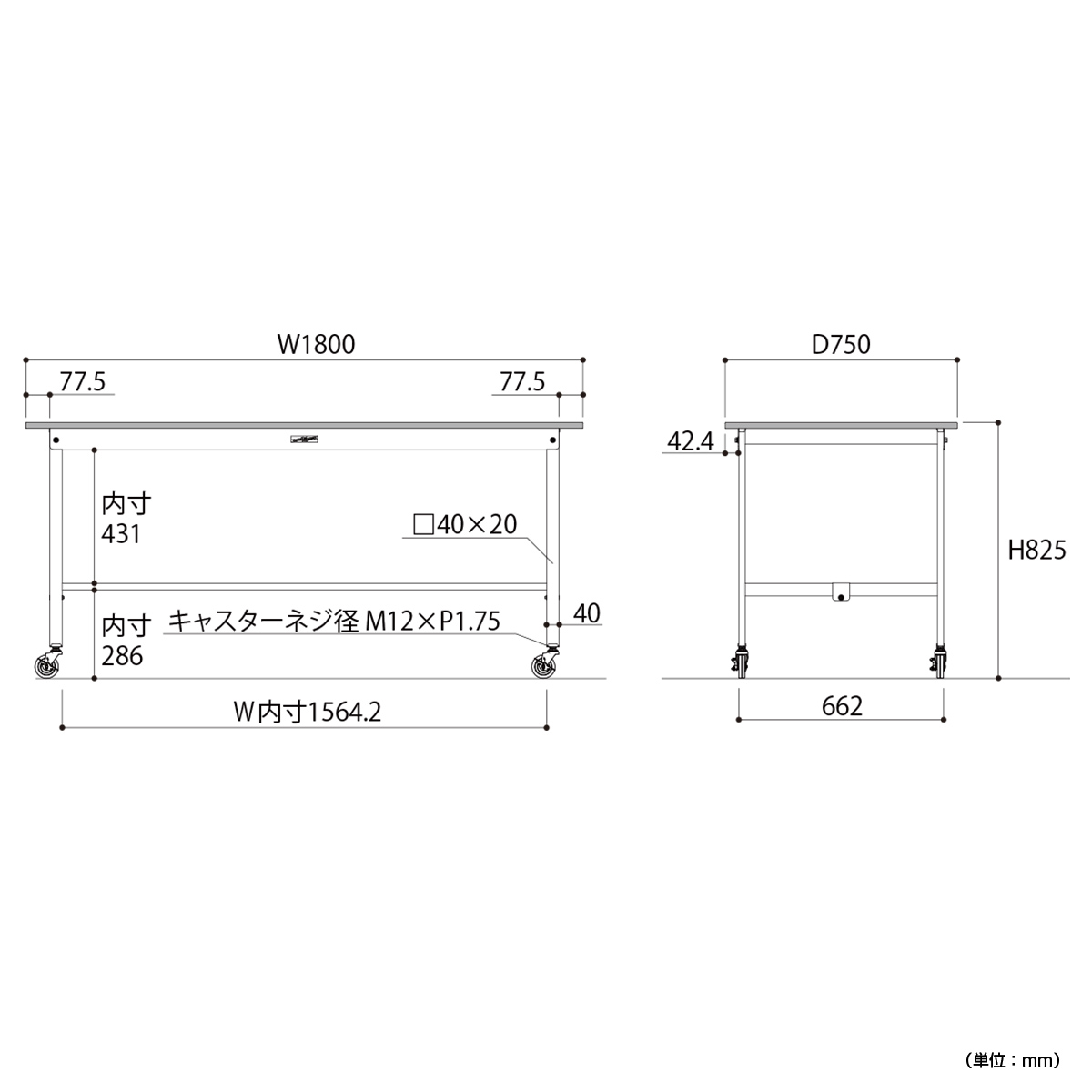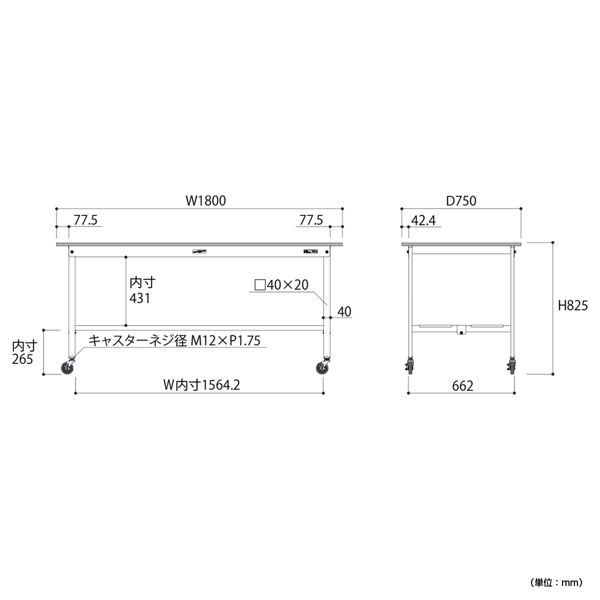 | 材質 | 天板:低圧メラミン(19mm厚) 脚部・棚板:スチール(粉体塗装) キャスター:75Φゴムキャスター(自在ストッパー付4個) |