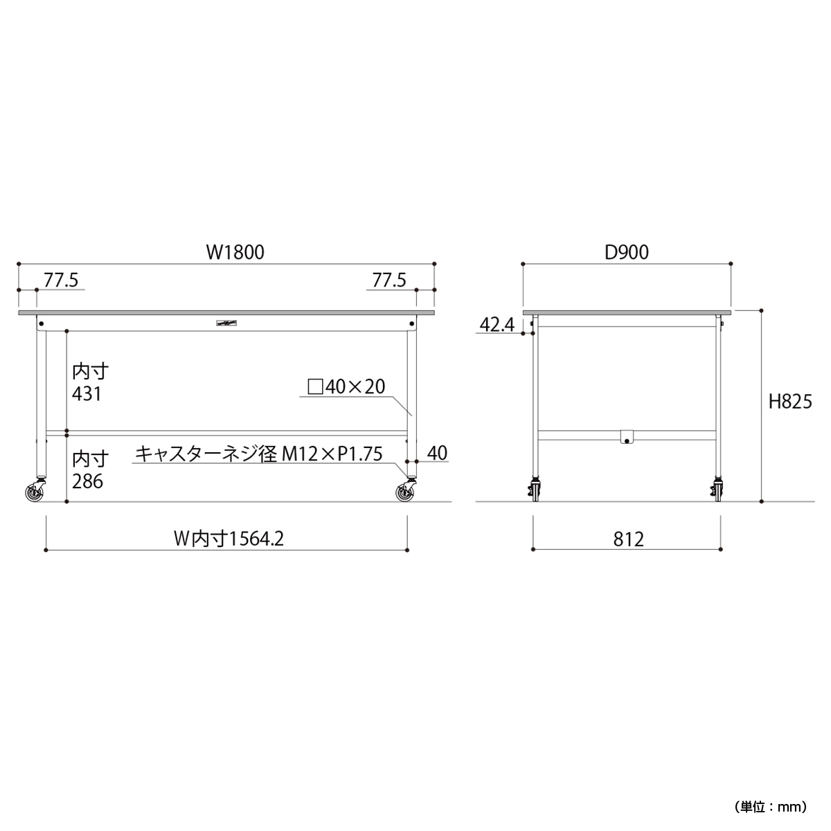| 材質 | 天板:低圧メラミン(19mm厚) 脚部・棚板:スチール(粉体塗装) キャスター:75Φゴムキャスター(自在ストッパー付4個) |