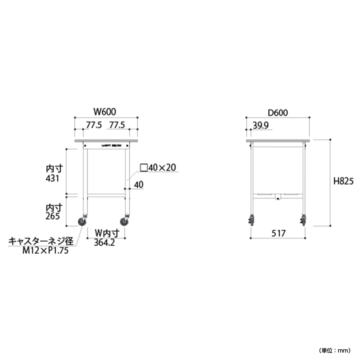 | 材質 | 天板:低圧メラミン(19mm厚) 脚部・棚板:スチール(粉体塗装) キャスター:75Φゴムキャスター(自在ストッパー付4個) |
