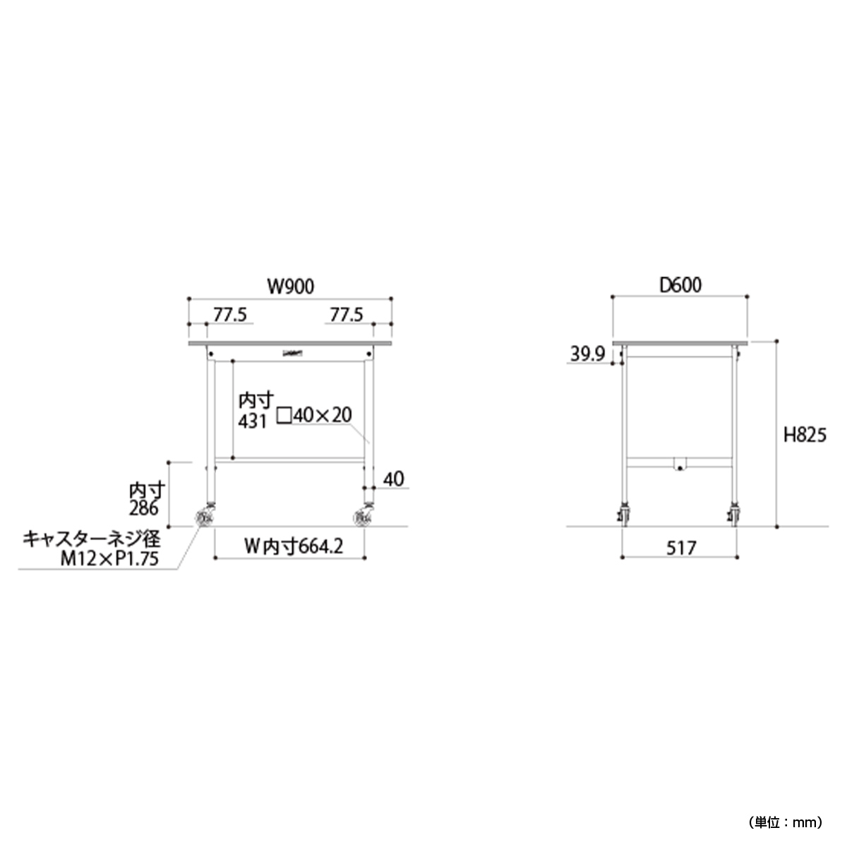 | 材質 | 天板:低圧メラミン(19mm厚) 脚部・棚板:スチール(粉体塗装) キャスター:75Φゴムキャスター(自在ストッパー付4個) |