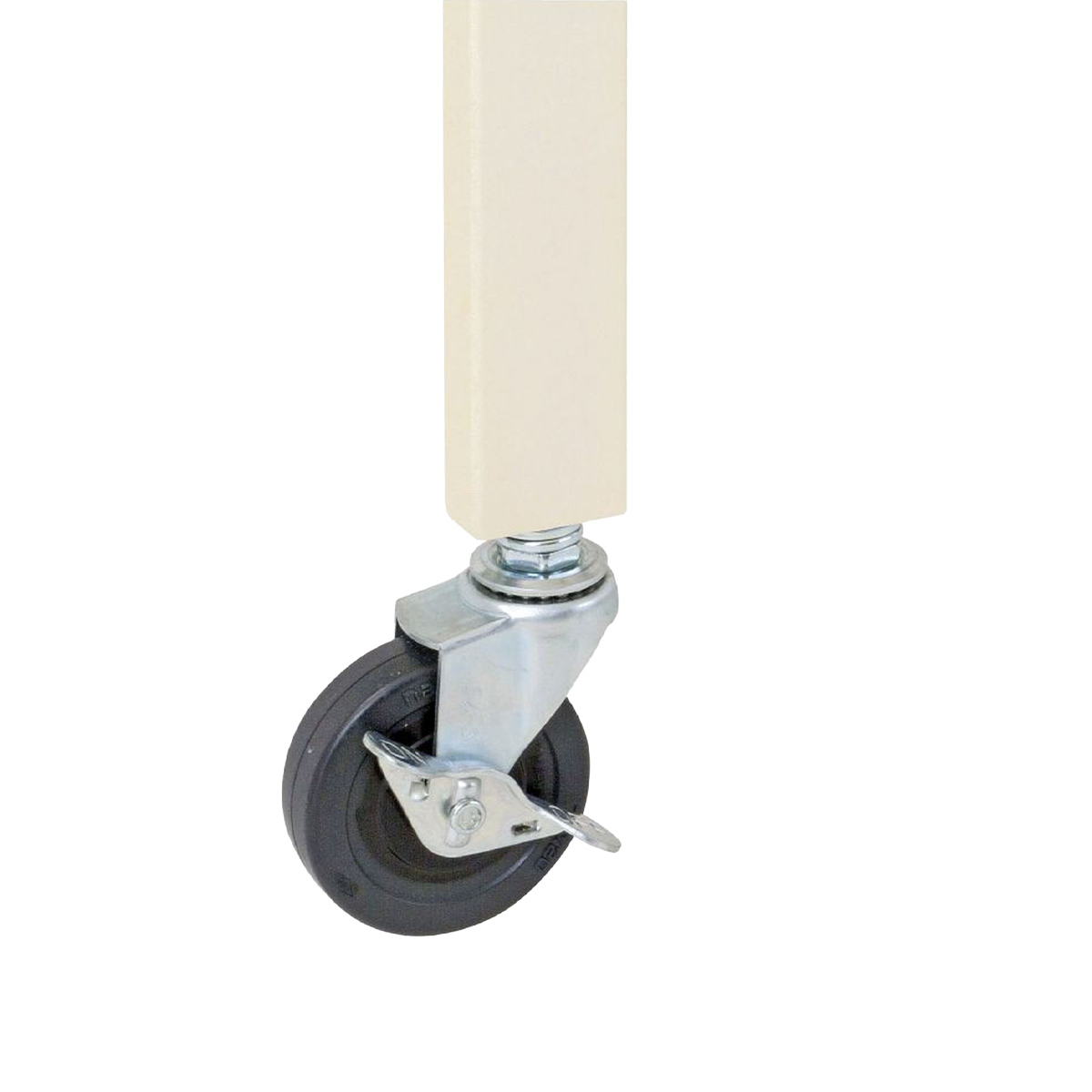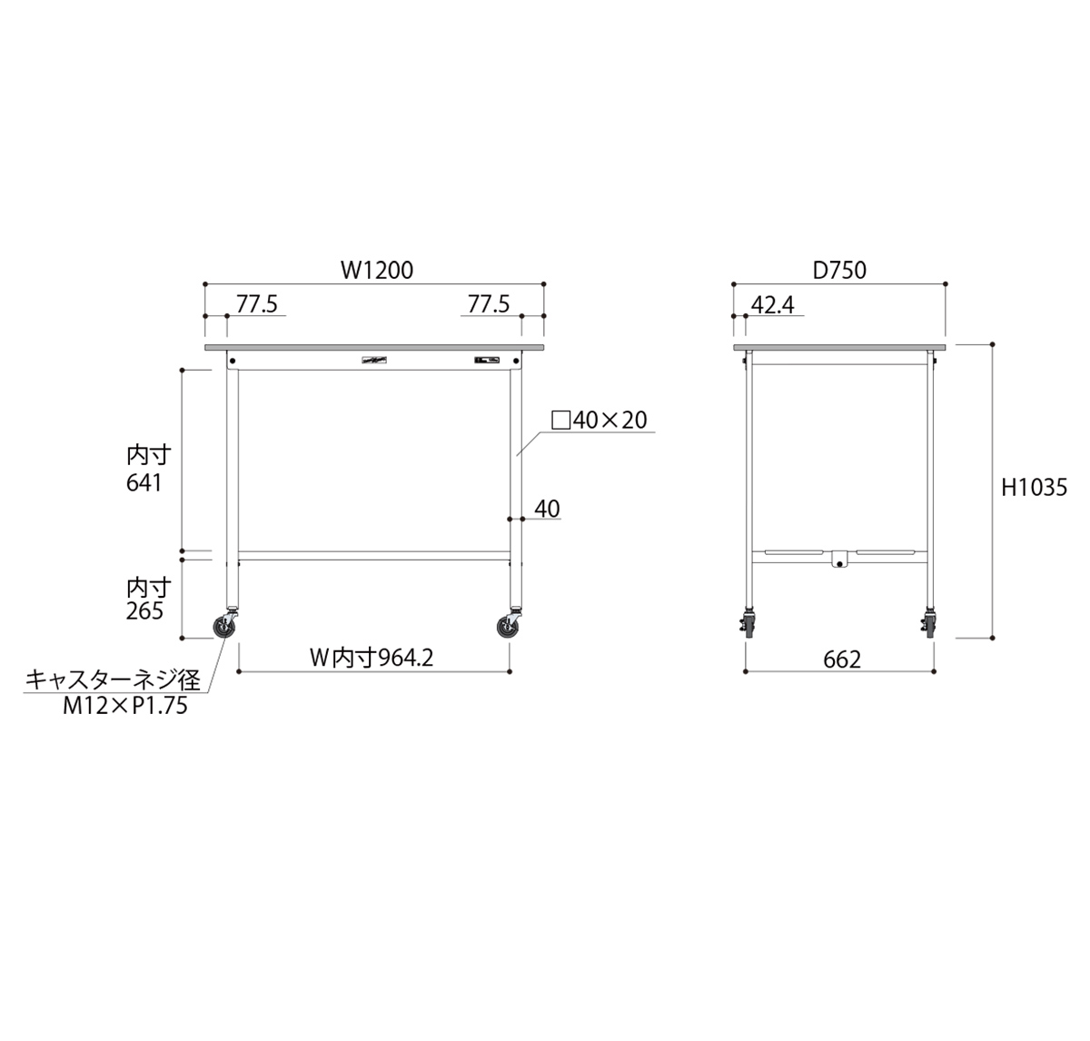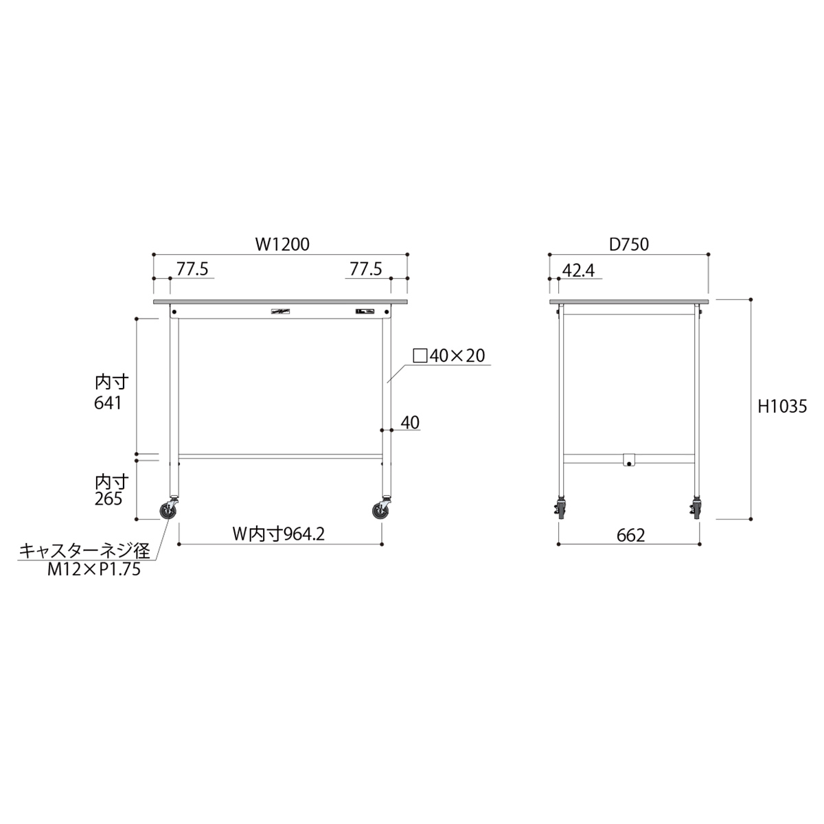 | 材質 | 天板:低圧メラミン(19mm厚) 脚部・棚板:スチール(粉体塗装) キャスター:75Φゴムキャスター(自在ストッパー付4個) |