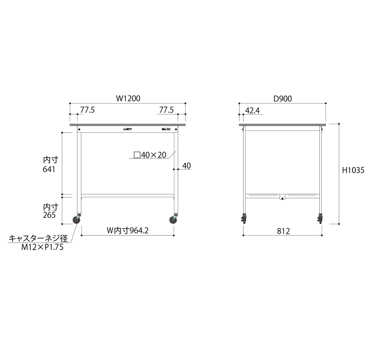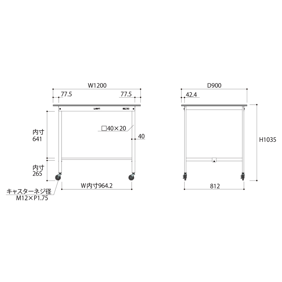 | 材質 | 天板:低圧メラミン(19mm厚) 脚部・棚板:スチール(粉体塗装) キャスター:75Φゴムキャスター(自在ストッパー付4個) |
