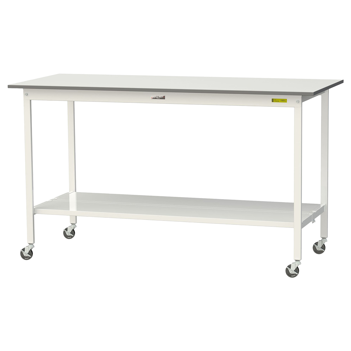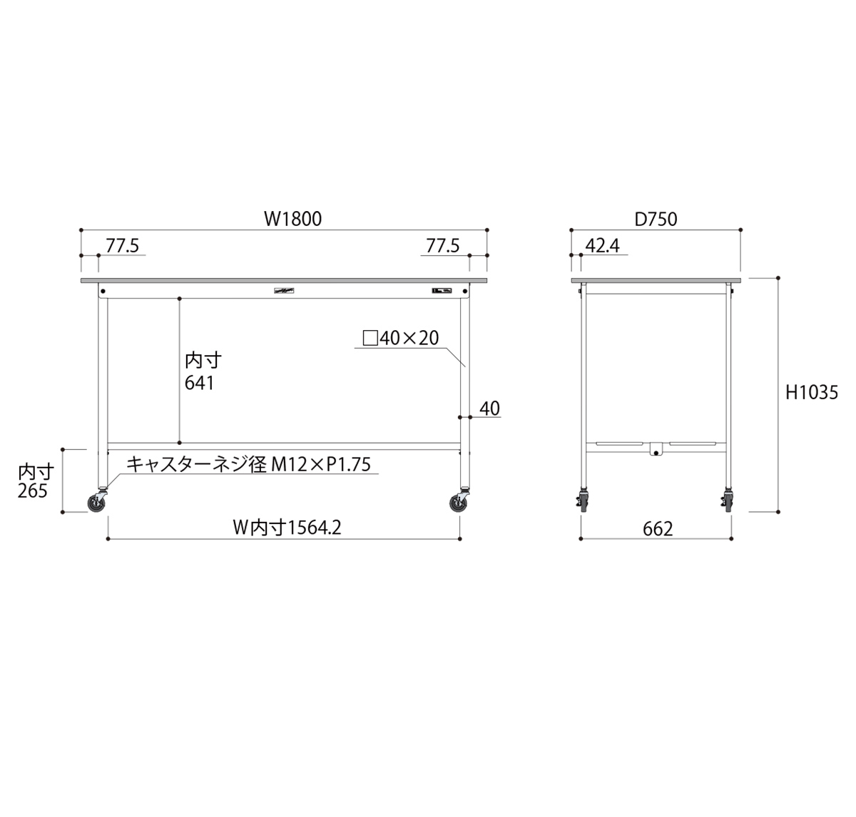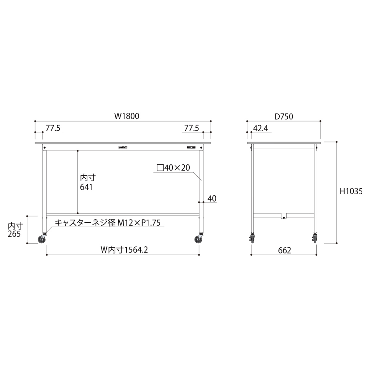 | 材質 | 天板:低圧メラミン(19mm厚) 脚部・棚板:スチール(粉体塗装) キャスター:75Φゴムキャスター(自在ストッパー付4個) |