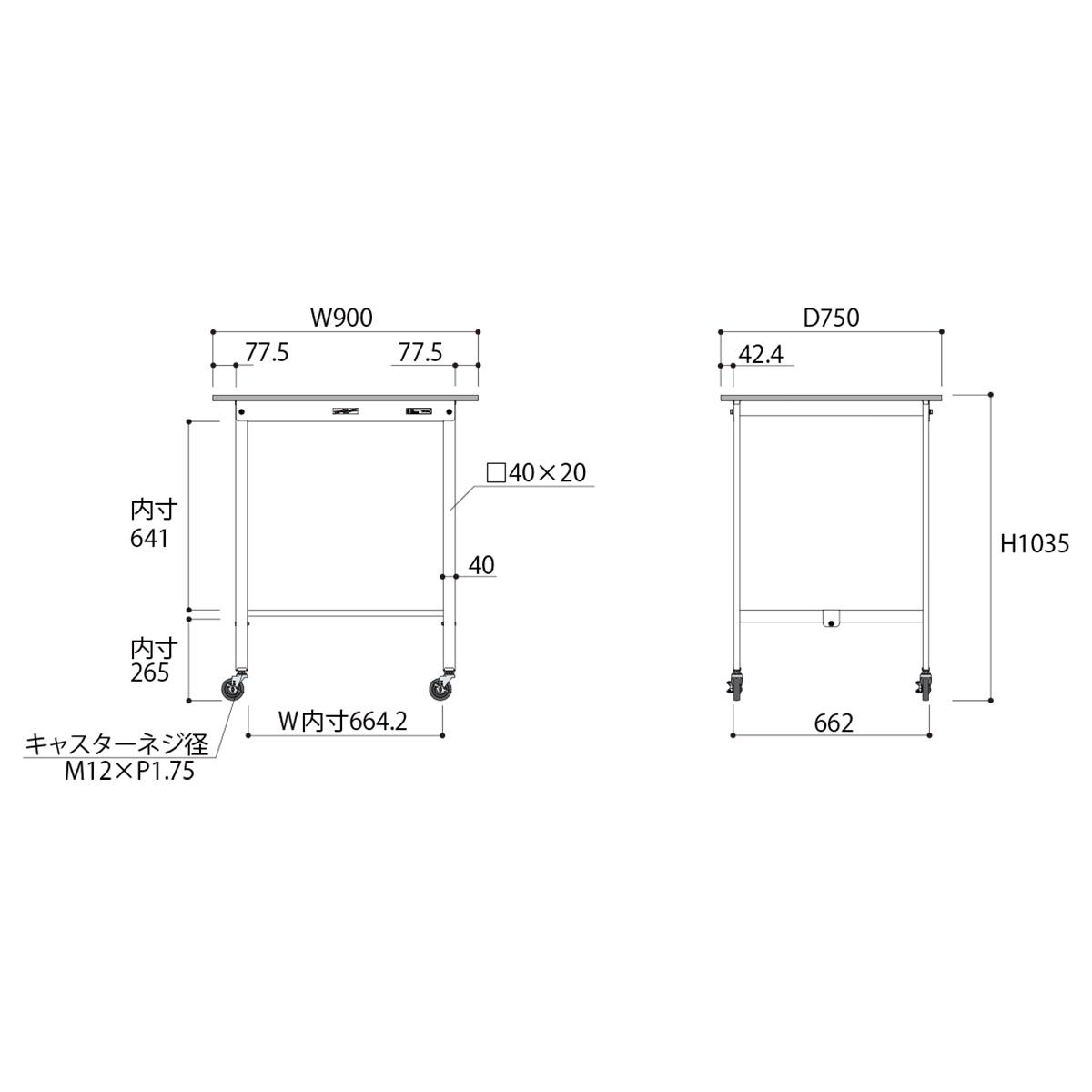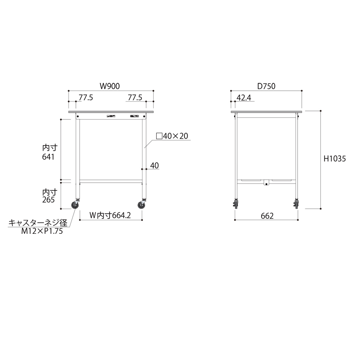 | 材質 | 天板:低圧メラミン(19mm厚) 脚部・棚板:スチール(粉体塗装) キャスター:75Φゴムキャスター(自在ストッパー付4個) |