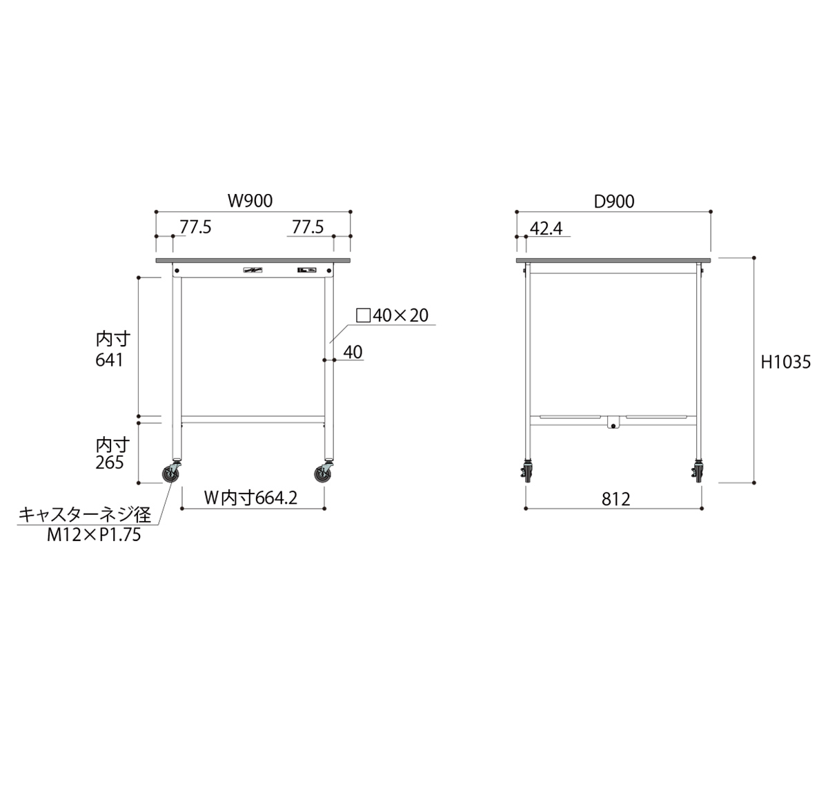 | 材質 | 天板:低圧メラミン(19mm厚) 脚部・棚板:スチール(粉体塗装) キャスター:75Φゴムキャスター(自在ストッパー付4個) |