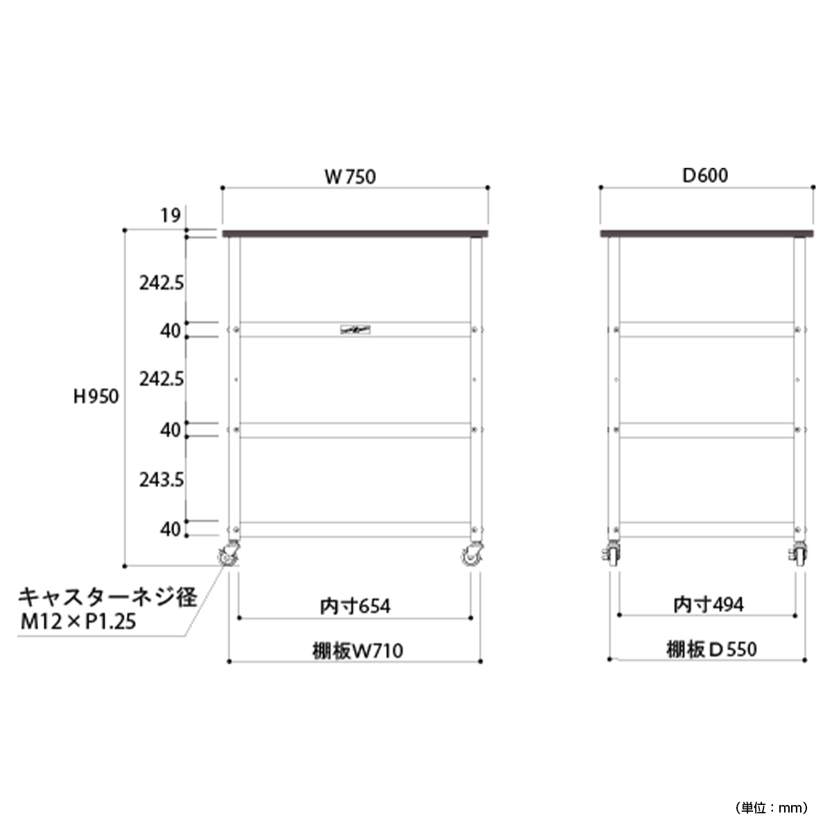 | 材質 | 天板:低圧メラミン(19mm厚) 脚部:スチール(粉体塗装) キャスター:50Φエラストマーキャスター(ストッパー付2個、自在2個) |