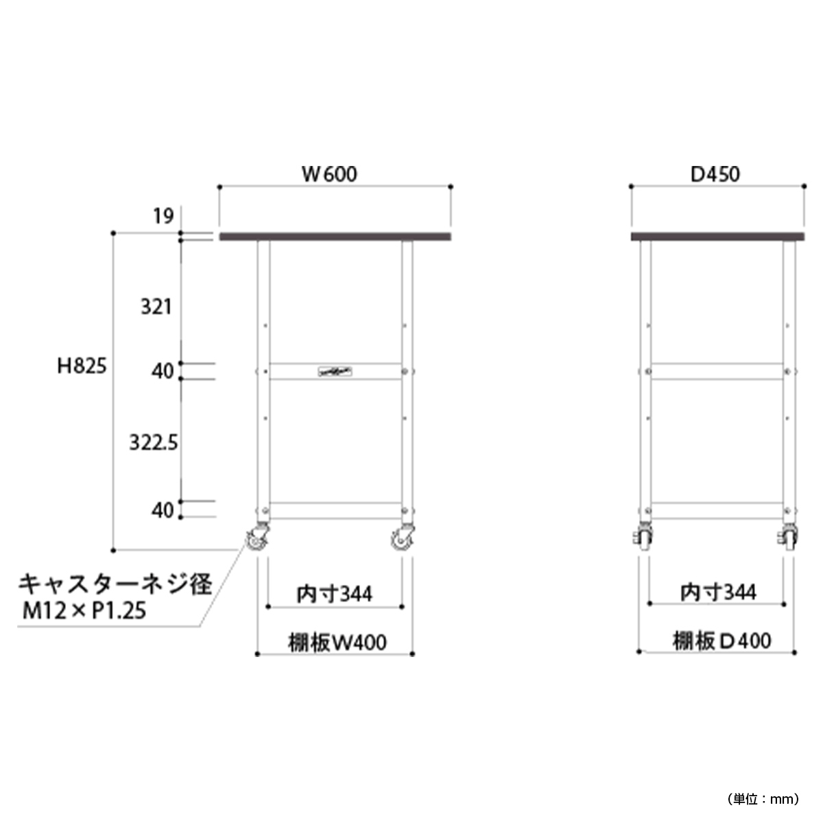 | 材質 | 天板:低圧メラミン(19mm厚) 脚部:スチール(粉体塗装) キャスター:50Φエラストマーキャスター(ストッパー付2個、自在2個) |