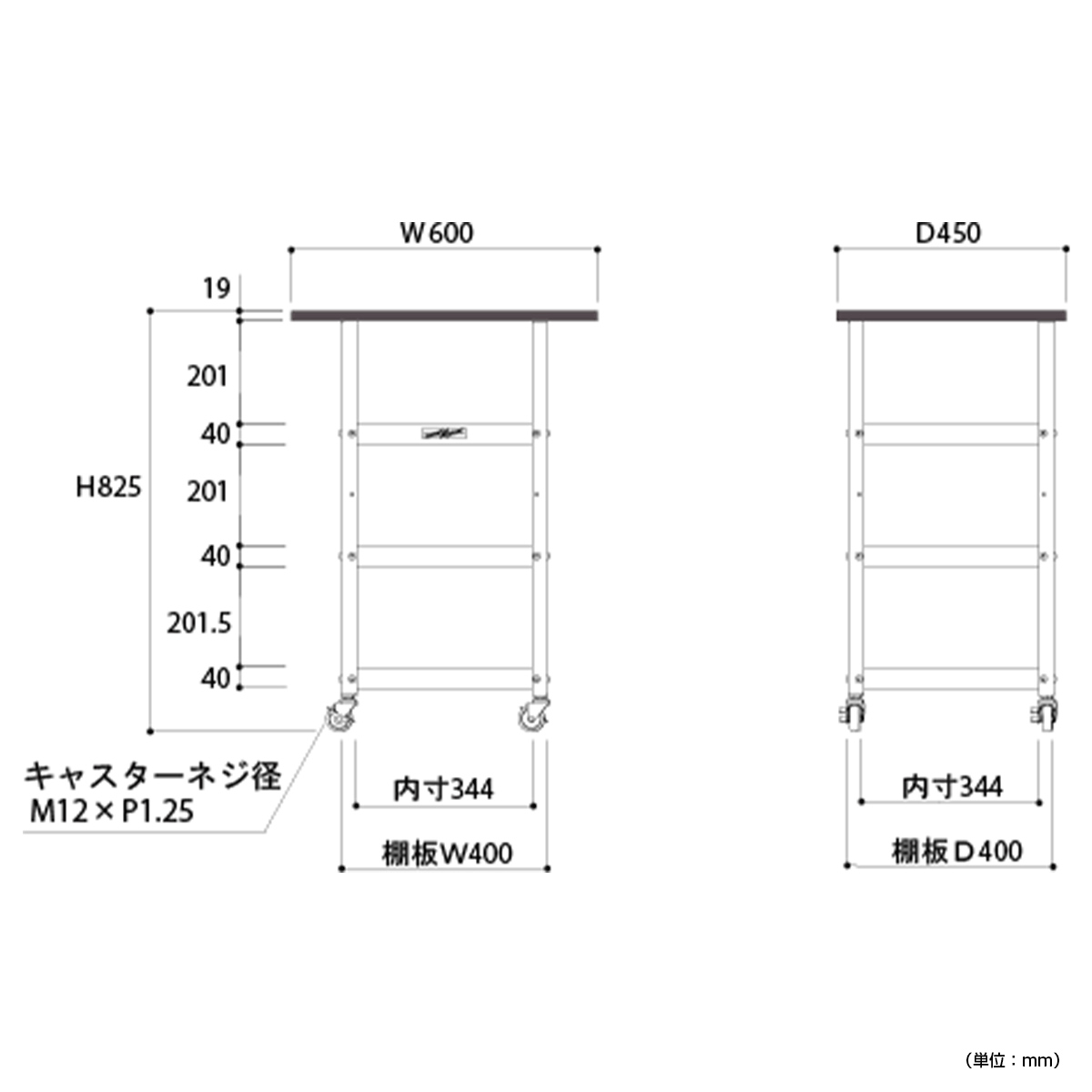 | 材質 | 天板:低圧メラミン(19mm厚) 脚部:スチール(粉体塗装) キャスター:50Φエラストマーキャスター(ストッパー付2個、自在2個) |