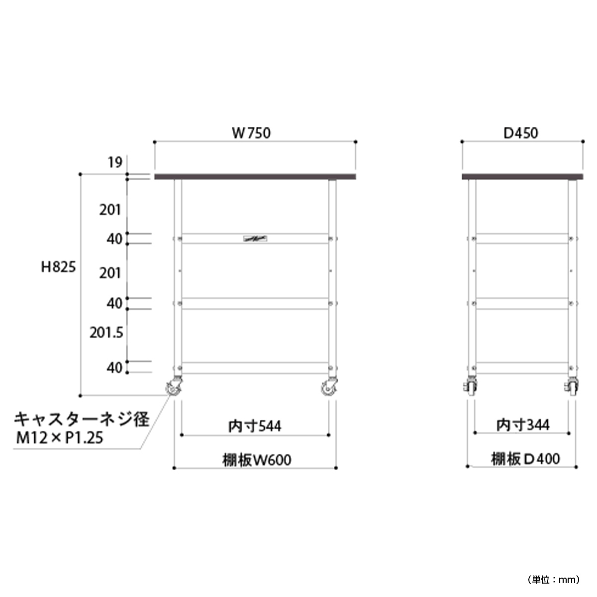 | 材質 | 天板:低圧メラミン(19mm厚) 脚部:スチール(粉体塗装) キャスター:50Φエラストマーキャスター(ストッパー付2個、自在2個) |