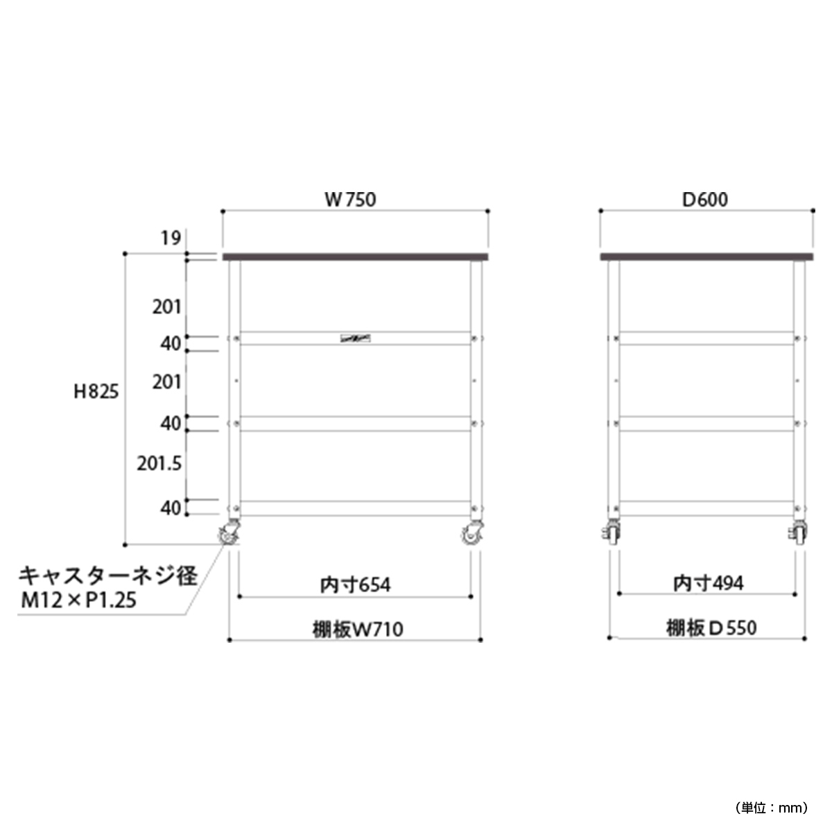 | 材質 | 天板:低圧メラミン(19mm厚) 脚部:スチール(粉体塗装) キャスター:50Φエラストマーキャスター(ストッパー付2個、自在2個) |