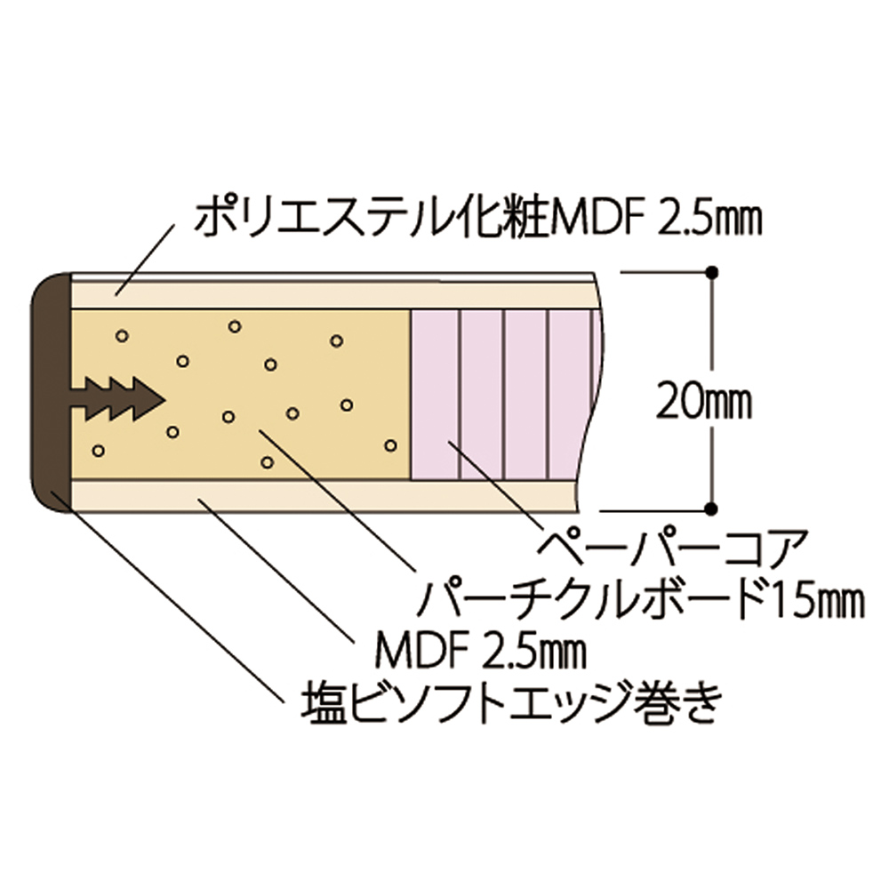 天板の側面は接触による傷つきを防ぐ塩ビのソフトエッジ巻きになっており、安全性も備えております。