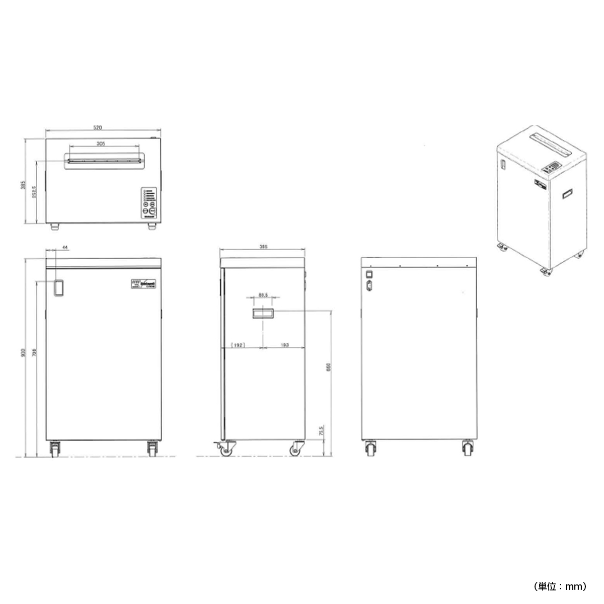 | 仕様 | 投入幅(対応用紙サイズ):305mm(A3) 細断方式:クロスカット 細断寸法:約4.5×30mm 最大細断枚数(50/60Hz):約30/28枚 定格細断枚数(50/60Hz):約14/12枚 電源:100V・50/60Hz 定格消費電力(50/60Hz):390/360W |