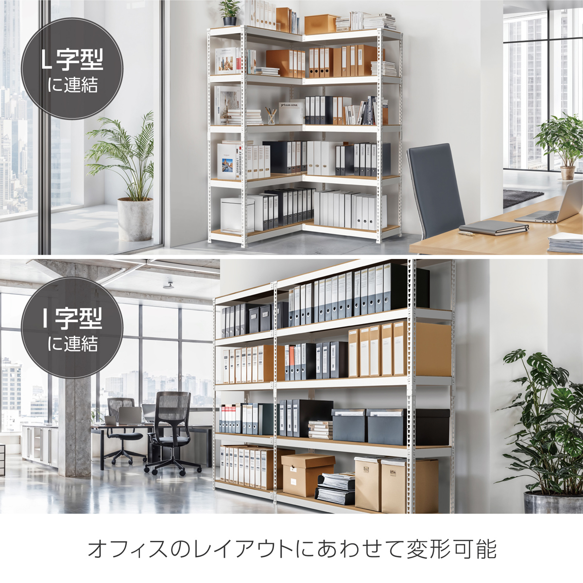 I型(並列)やL型(コーナー)に連結が可能で、空間に合わせたレイアウトが自由自在。特にL型連結時は、コーナー部分に支柱がない設計のため、物の出し入れがスムーズでデッドスペースを有効活用できます。
