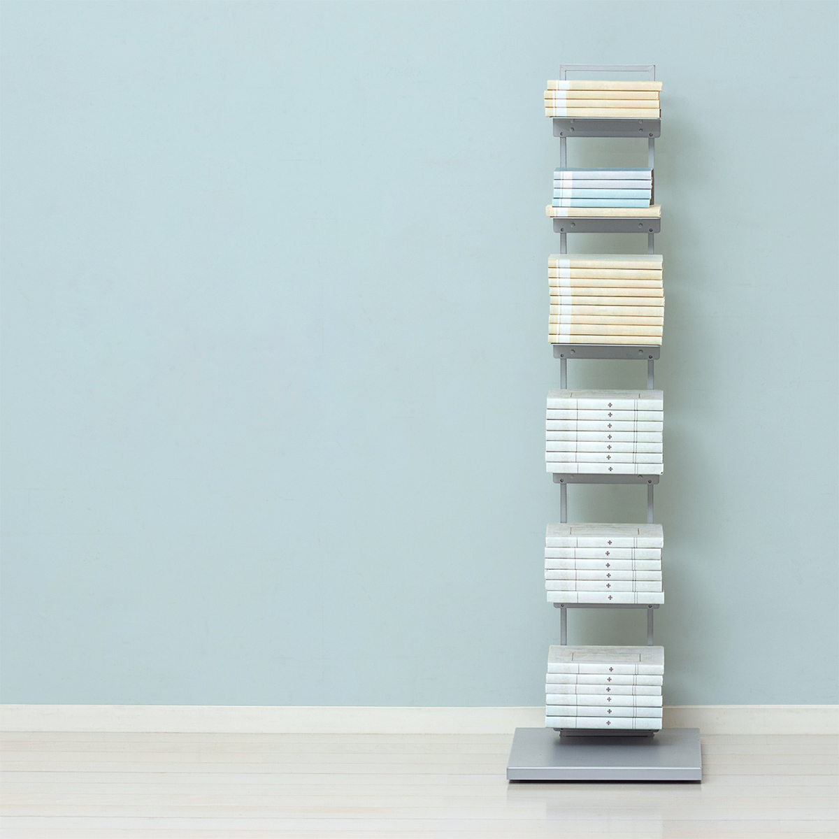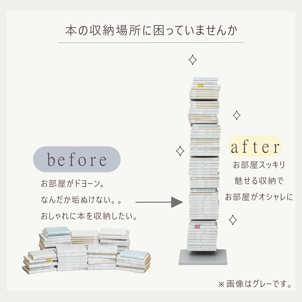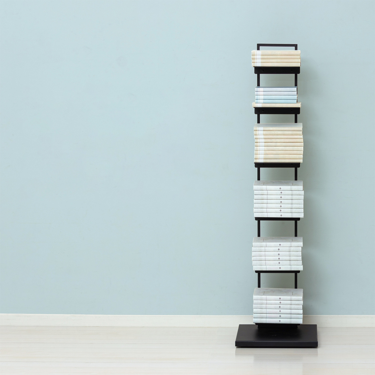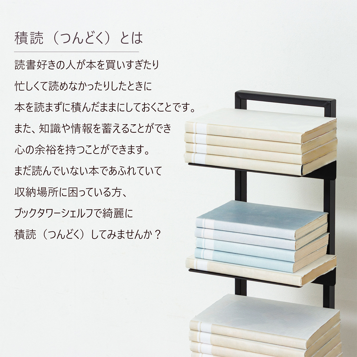 読みかけの本や小物をすっきりまとめられるタワー型シェルフで、限られたスペースにも置きやすいスリムな形状が特徴です。