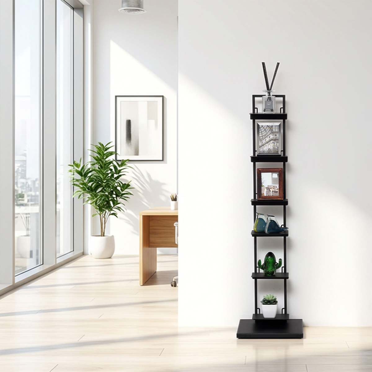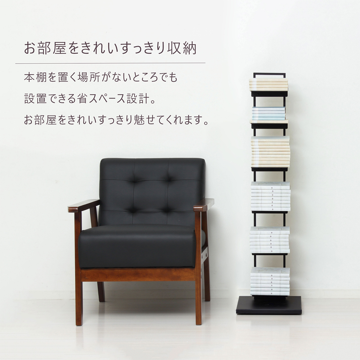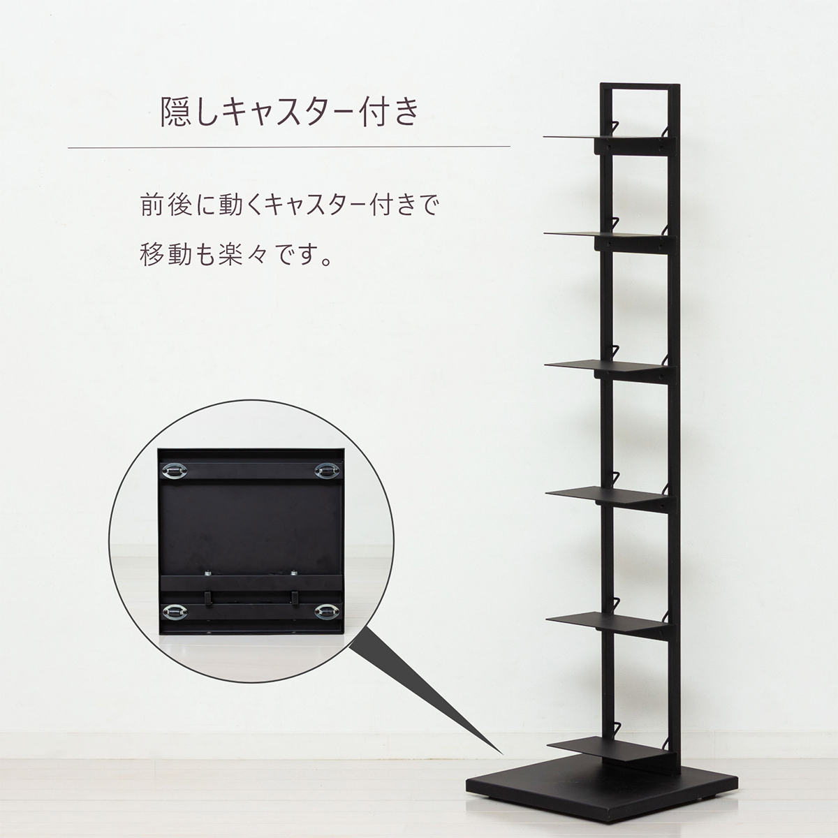 限られたスペースにすっきり収まるスリムなタワー型シェルフ。
