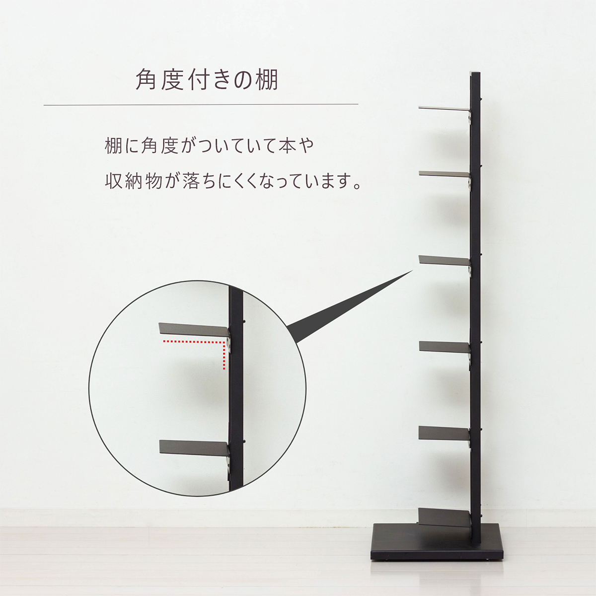 各棚にはわずかな角度がついており、本が前に落ちにくい構造で、日常使いのアイテムを安心して収納できます。