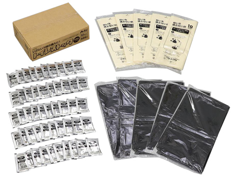 | 材質 | トイレ:強化段ボール 凝固剤:高吸水性樹脂 排便袋・消臭袋:PE テント:ポリエステル |