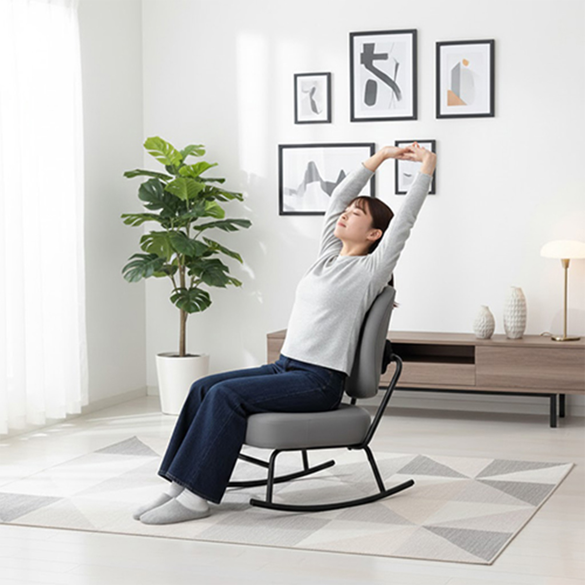オフィスの休憩スペースや来客エリアに気軽に置けるコンパクトなロッキングチェアで、軽い揺れがほどよいリフレッシュ時間をつくってくれます。