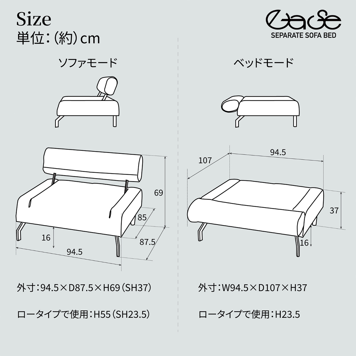 | サイズ | 【1脚あたり】()内はロータイプ時 ソファ:W945×D875×H690(550)mm 座面高:370(235)mm ベッド:W945×D1070×H370(235)mm |