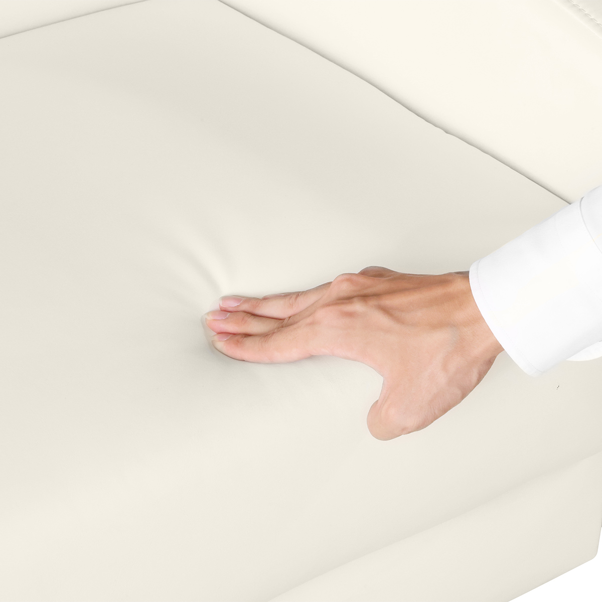 張地には汚れに強くお手入れがしやすいPVCレザーを、座面にはウレタンフォームを採用し、確かなクッション性で快適な座り心地を実現。