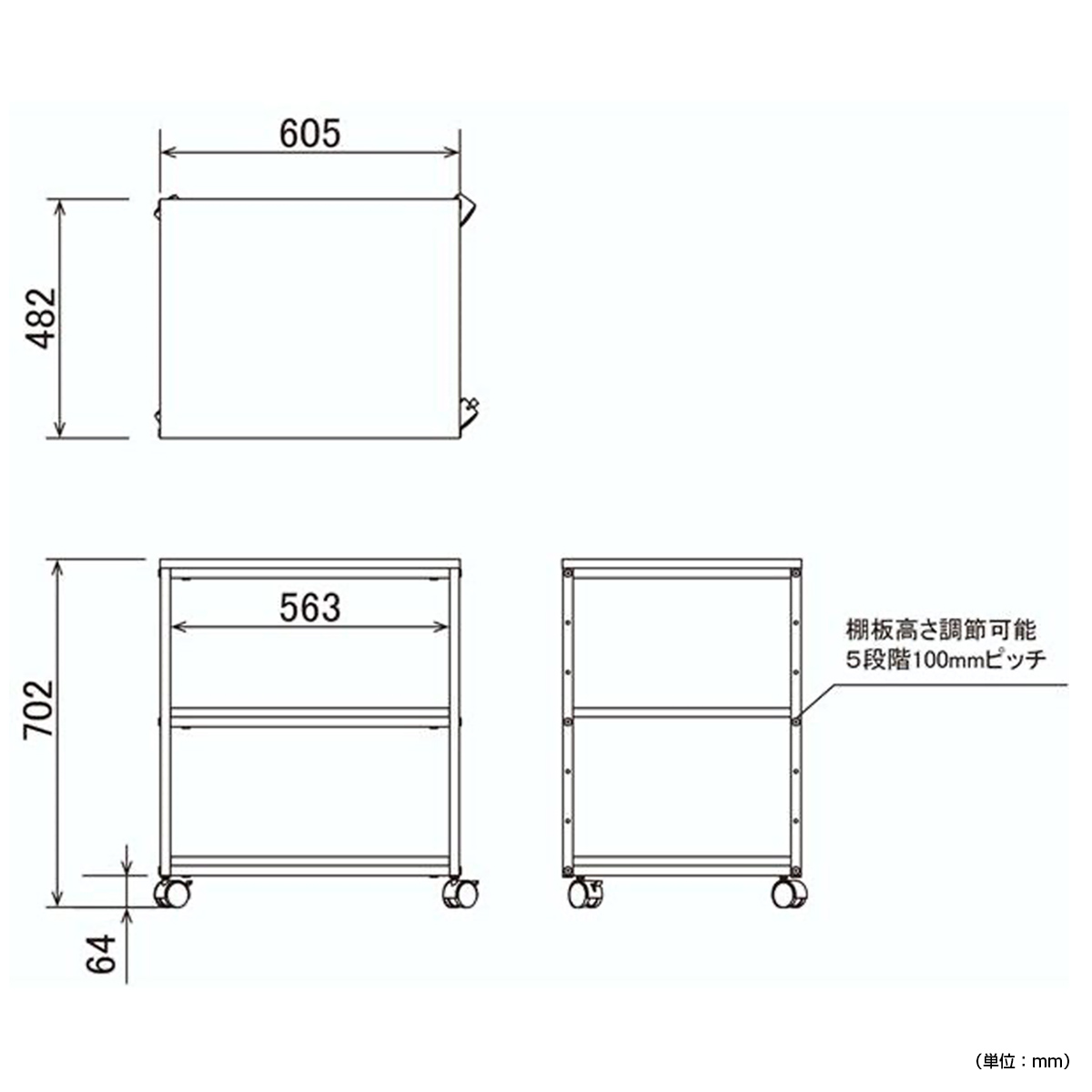 | 機能 | 可動棚:100mmピッチ5段階高さ調節可能 キャスター付き(ストッパー付き×2個) |