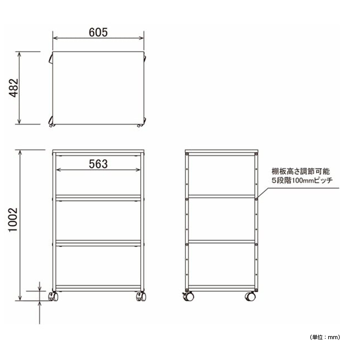 棚板は可動式で、収納物に合わせて100mmピッチで高さの調節が可能です。