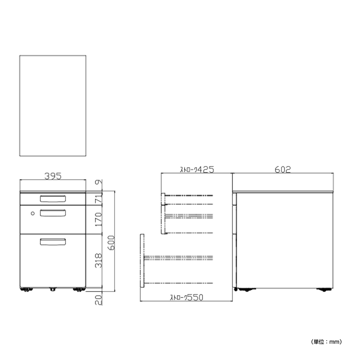 | 耐荷重 | 天板:約30kg 引出:(上段)約3kg 引出:(中・下段)約20kg |