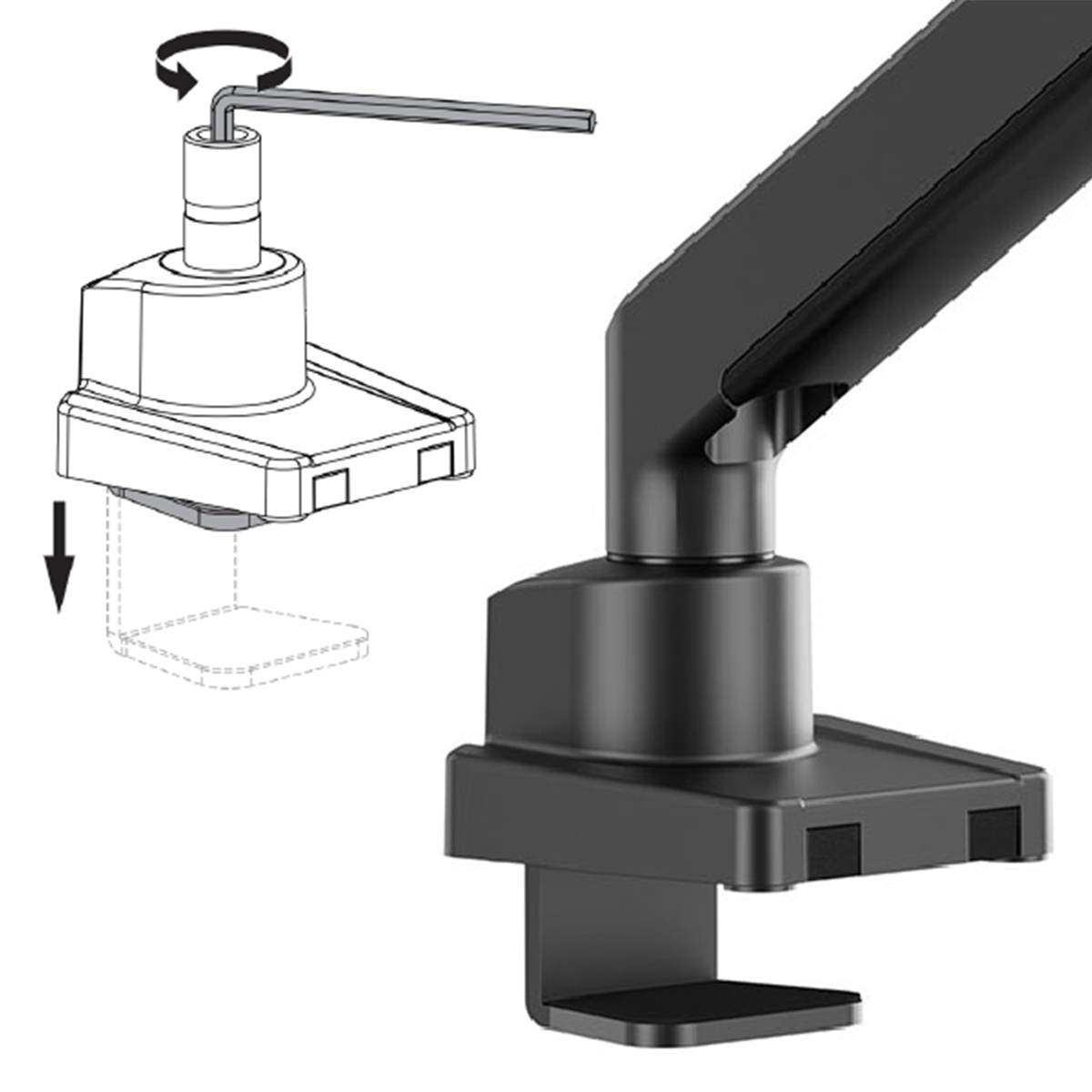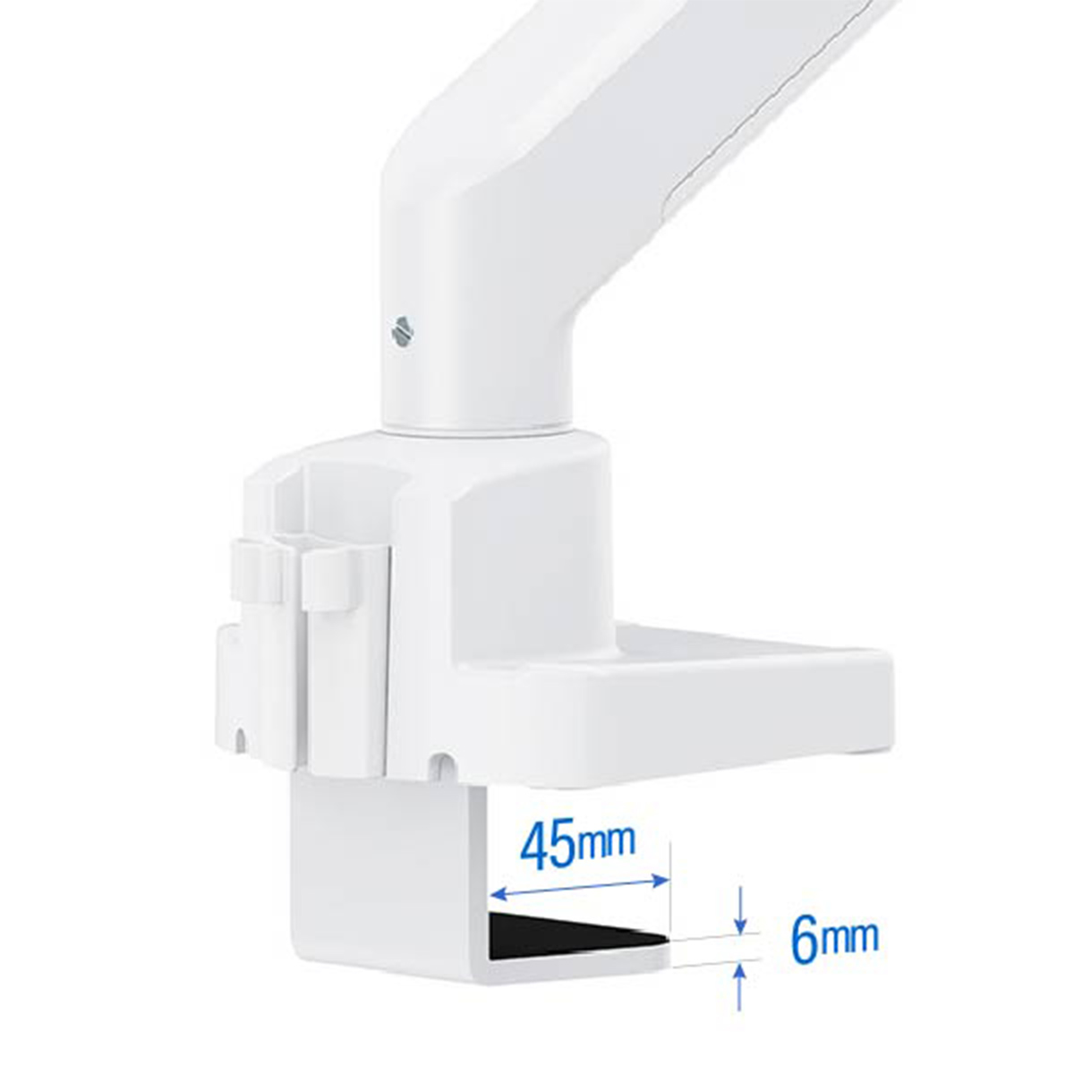 クランプは机上から簡単に取り付けができる上締めタイプを採用し、狭いスペースでもスムーズに設置できます。