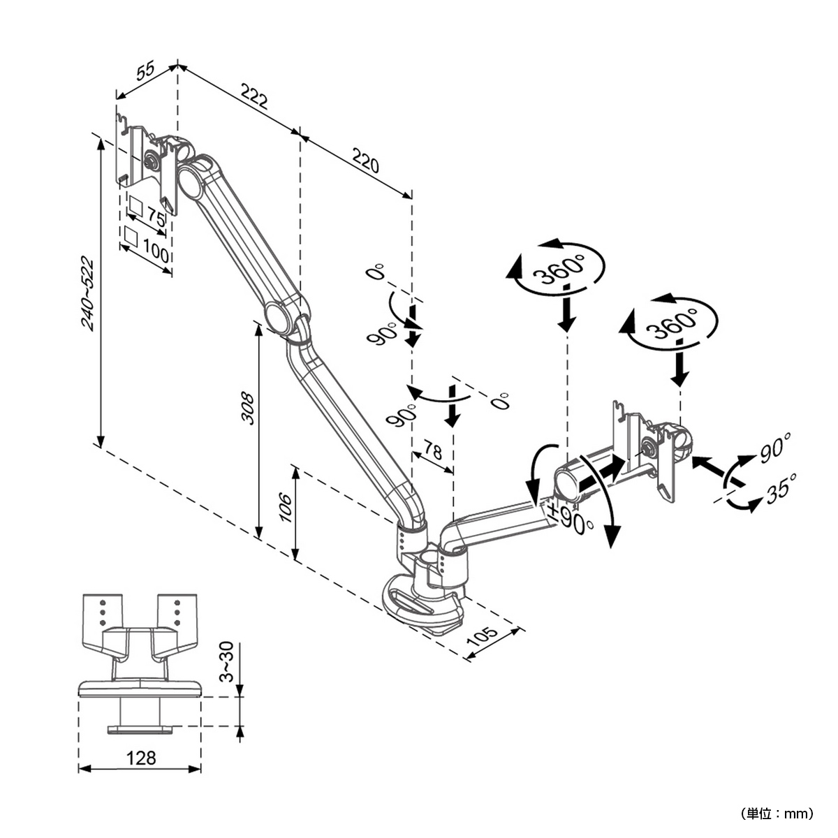 備考 | 取付可能天板厚:8~30mm 適合モニターサイズ:~26インチ(VESA規格【75×75mm】【100×100mm】の取付穴を有する液晶モニターが取り付けられます) ※一般的な目安となります。実際の使用には、モニターの重量とアームの耐荷重を基準としてください。 |