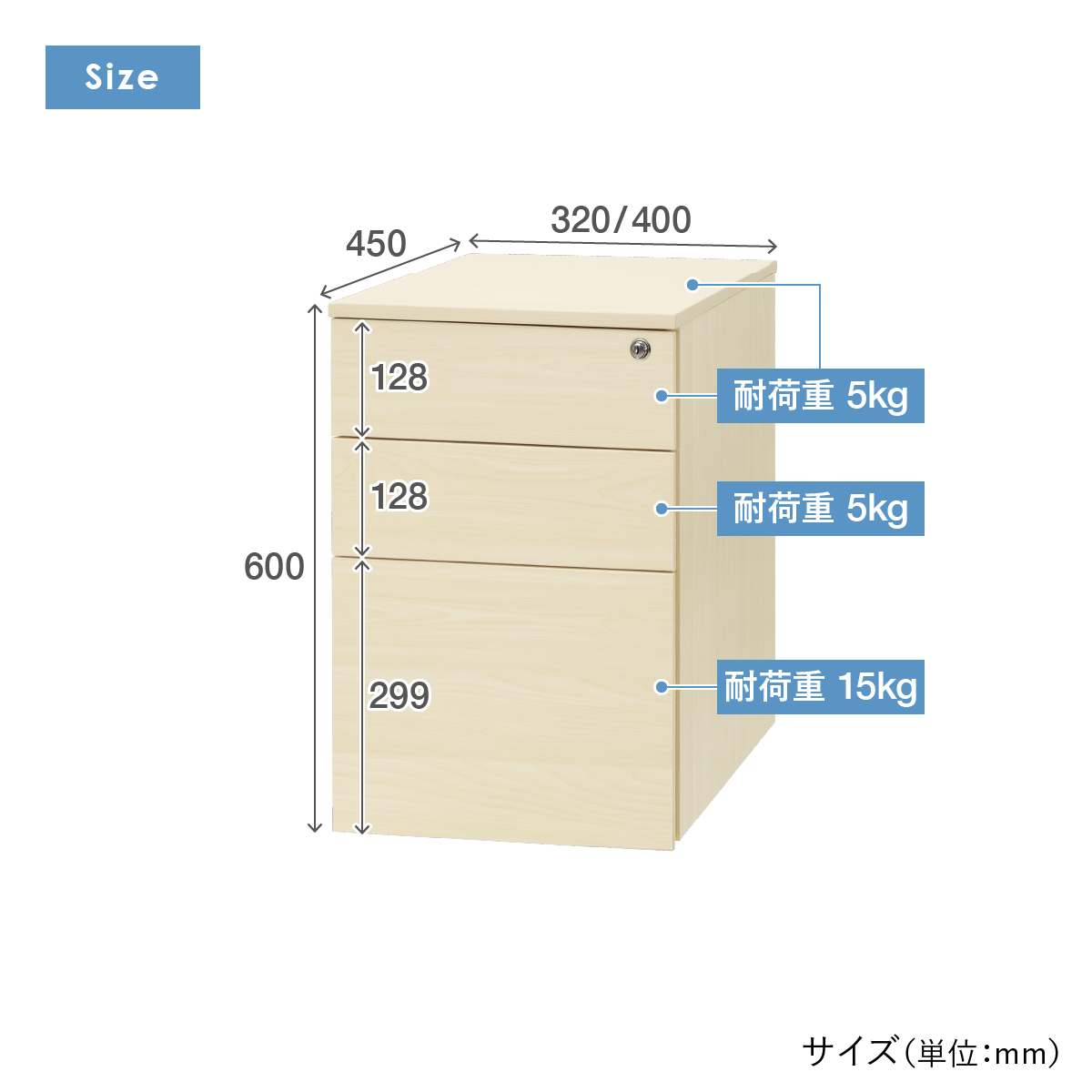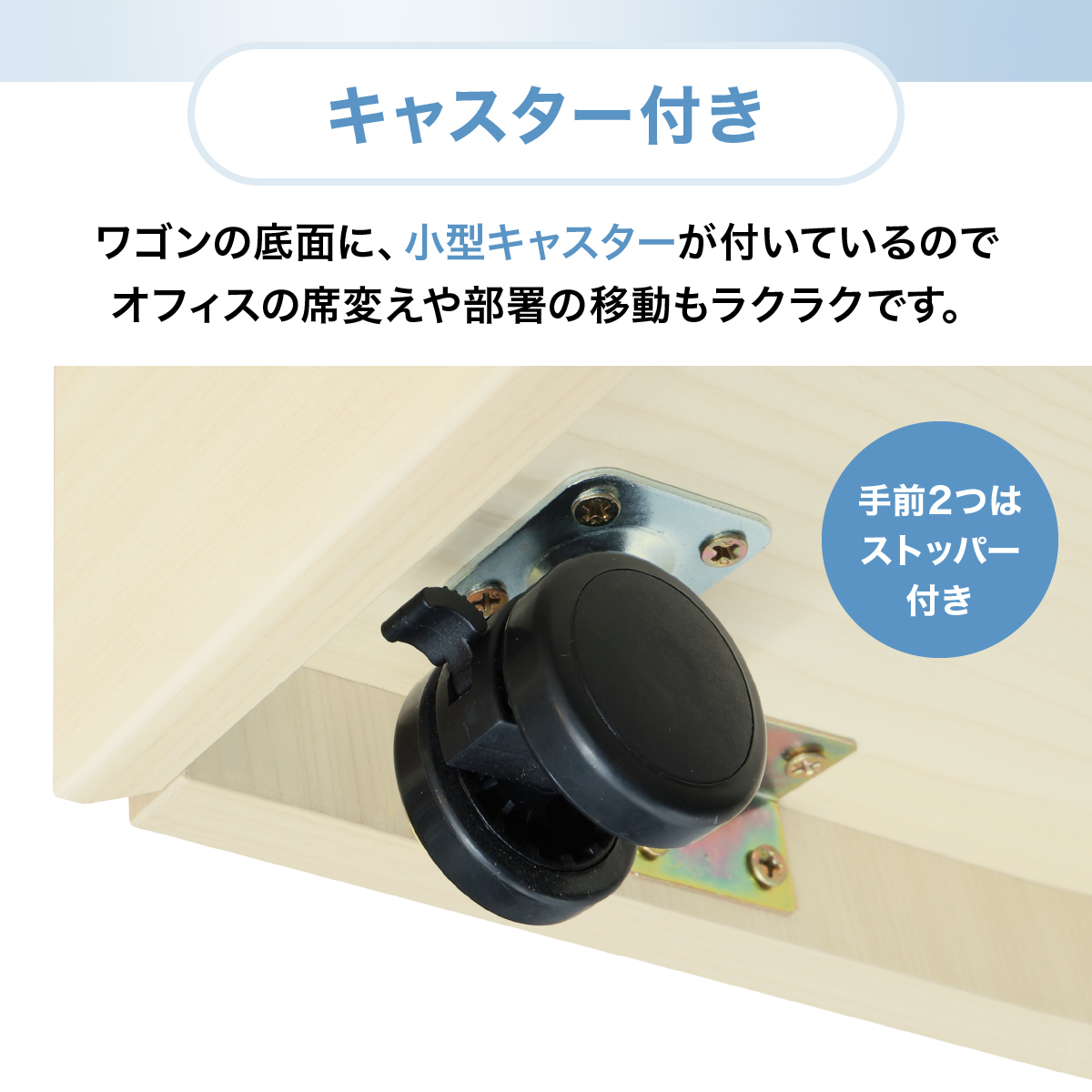 上段・中段は小物類に便利、最下段はA4ファイル対応の深型で、全段フルオープン仕様のため奥の書類まで出し入れがしやすく、日常業務を快適にサポート。