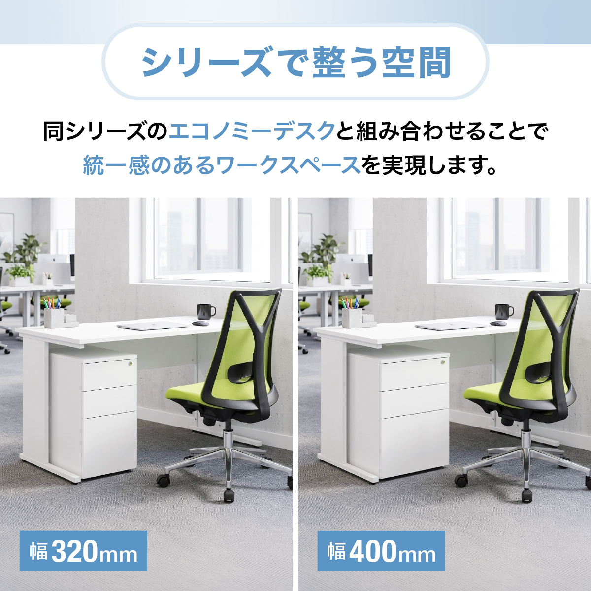 そのスマートさは、エコノミーデスクと組み合わせることでさらに自然な一体感を生み、ホワイトとナチュラルの2色からデスクと揃えて選べば、すっきり統一されたワークスペースを手軽に作れます。