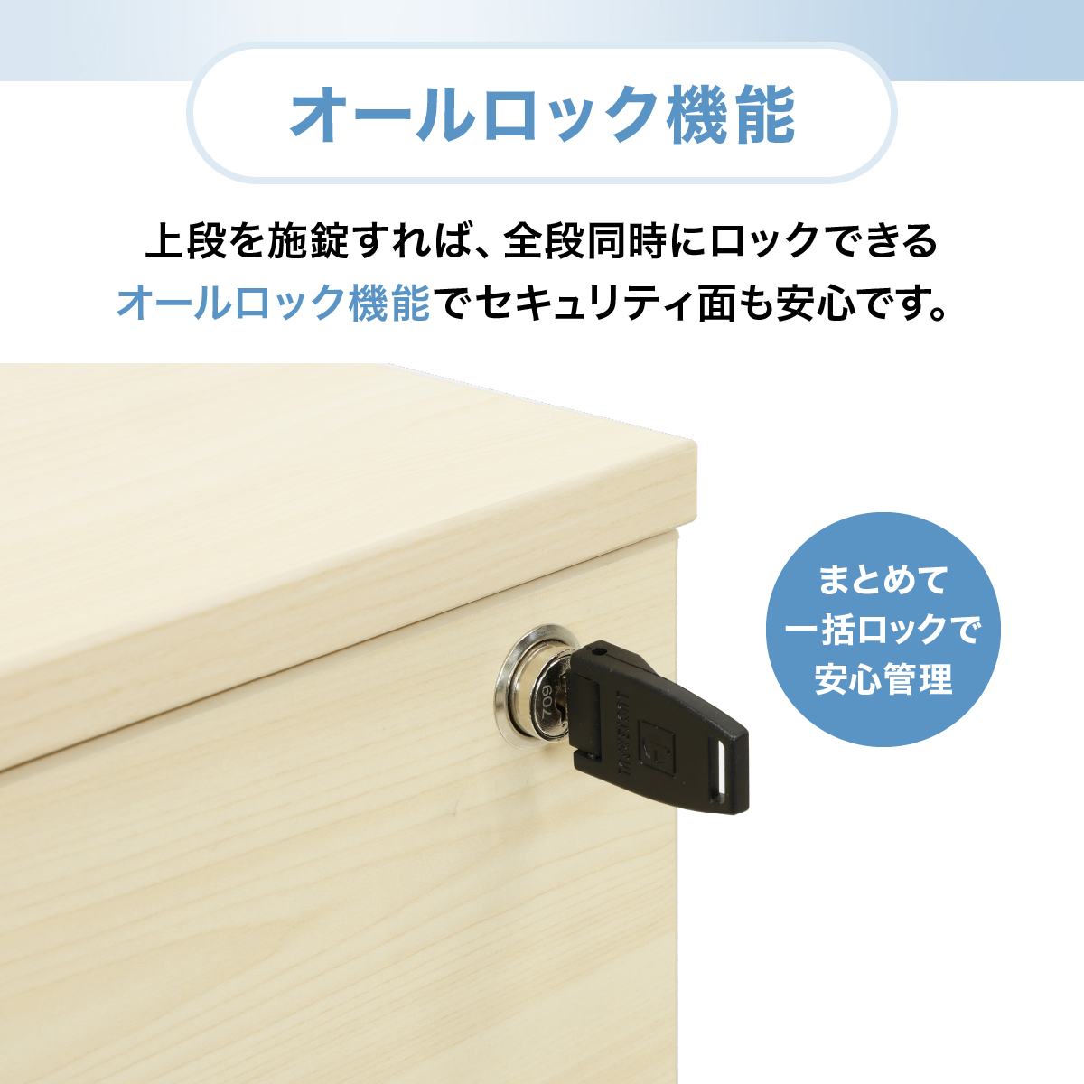 鍵1本で全段をまとめて施錠できる便利な機能で、オフィスの大切な書類の保管に最適なセキュリティ機能です。