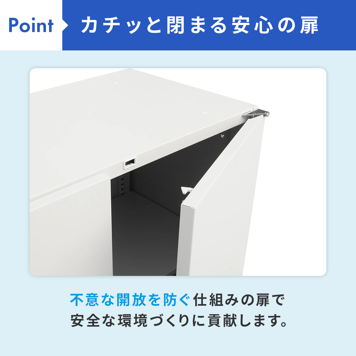 扉を閉めるとラッチが本体にしっかりと掛かることで不意な開放を防ぐ仕組みとなっており、日々の業務に集中できる安全な環境づくりに貢献します。