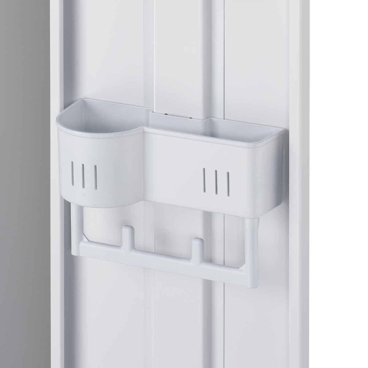 扉裏にはスマホやペットボトル等の置き所として便利な小物ポケットや、ネクタイ/タオルを掛けるタオル掛けが付属しています(※鏡は付属しません)。