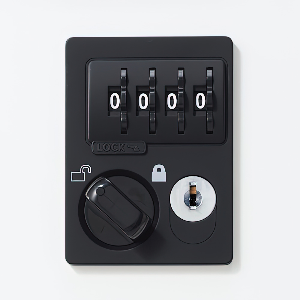 暗証番号を設定できる、ダイヤルキー式の小物入れロッカーとなっており、不特定多数の人間が使用する場合に適した自由変換式(施錠時任意の暗証番号を入力して使用する)と、特定の人が使用する場合に適した固定式(暗証番号を再登録するまで同番号を使用する)の切り替えが可能です。