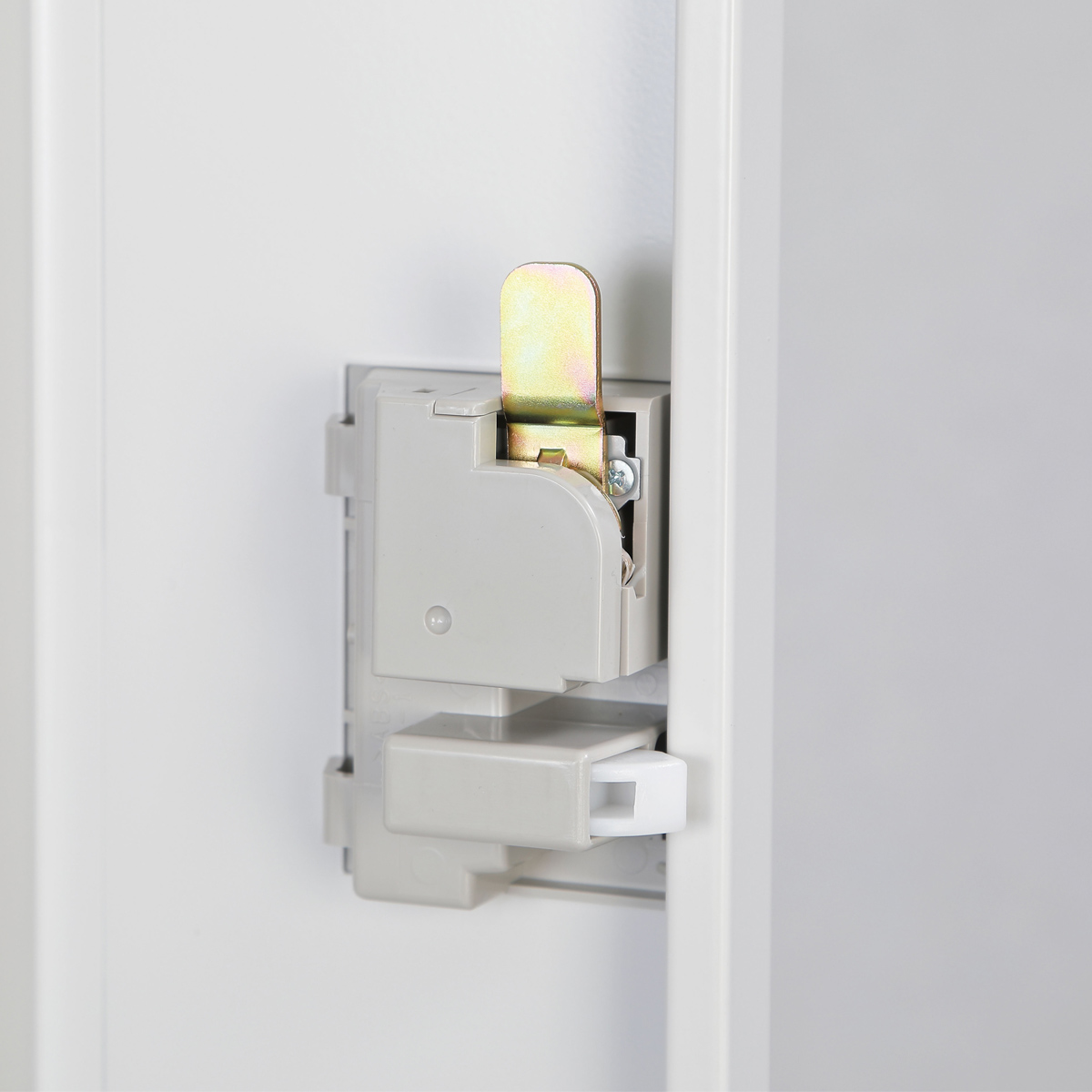 扉が閉まった状態を保持する留め具(キャッチ)が付いており、扉が自然に開いてしまうのを防いでくれます。
