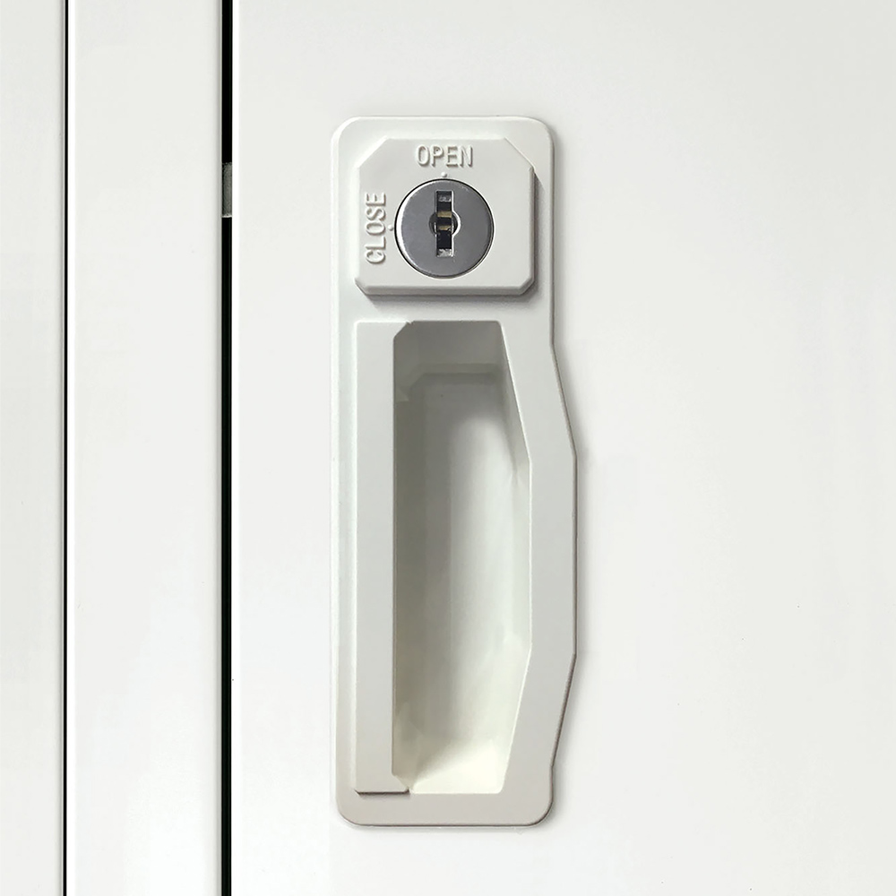 ロッカー扉の取っ手はラッチ付きです。外部からのこじ開けに強い、カマ錠を採用してあります。