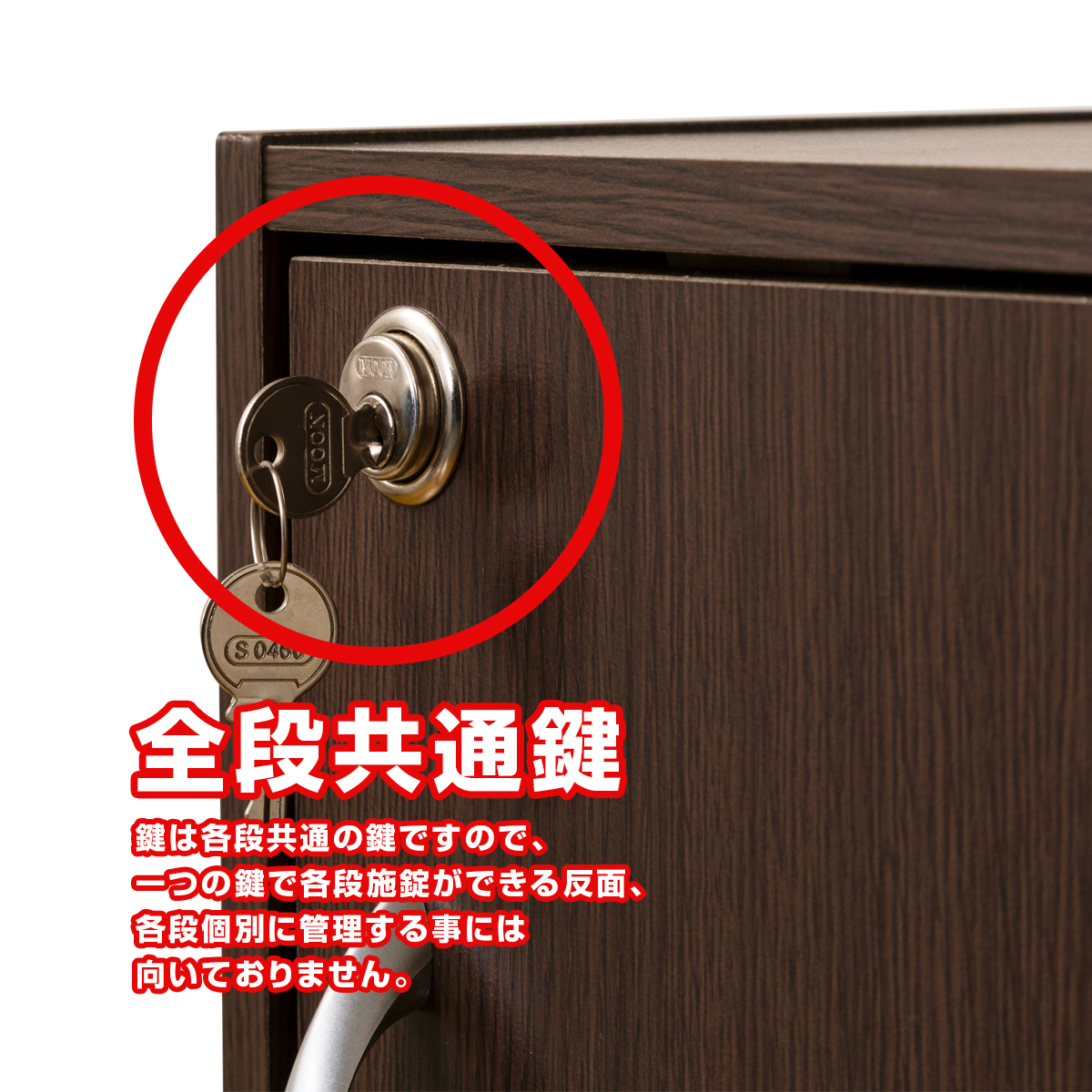 なお、鍵は各段共通の鍵ですので、一つの鍵で各段施錠ができる反面、各段個別に管理する事には向いておりません。