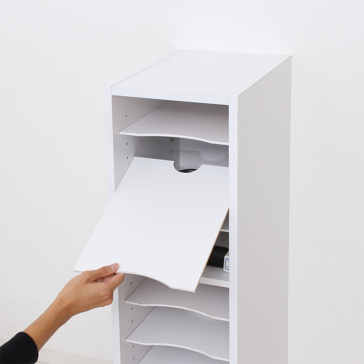 背面にはコード通し穴、棚板には切り欠き加工を施し、タブレットやノートPCを充電しながら収納可能。