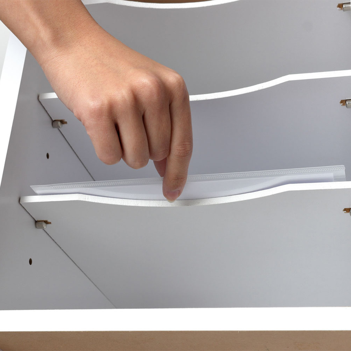 手前の湾曲形状により、収納物を1つずつスムーズに取り出すことができ、整理整頓がしやすい設計になっています。